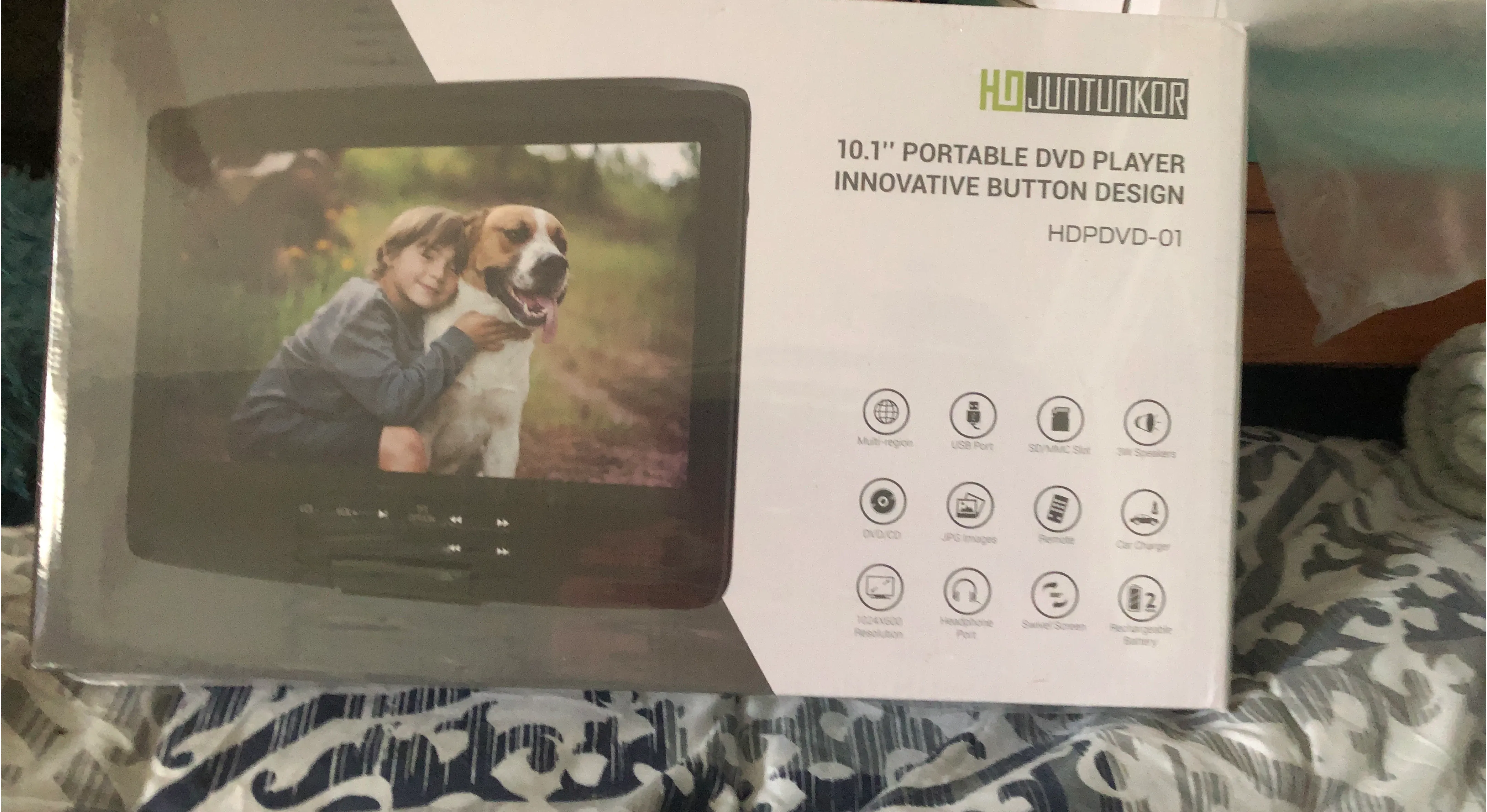 This is a Juntunkor 10.1" portable DVD player. It has a USB port, SD/MMC slot, and supports DVD/CD playback. It also has a rechargeable battery and a swivel screen! Never been open