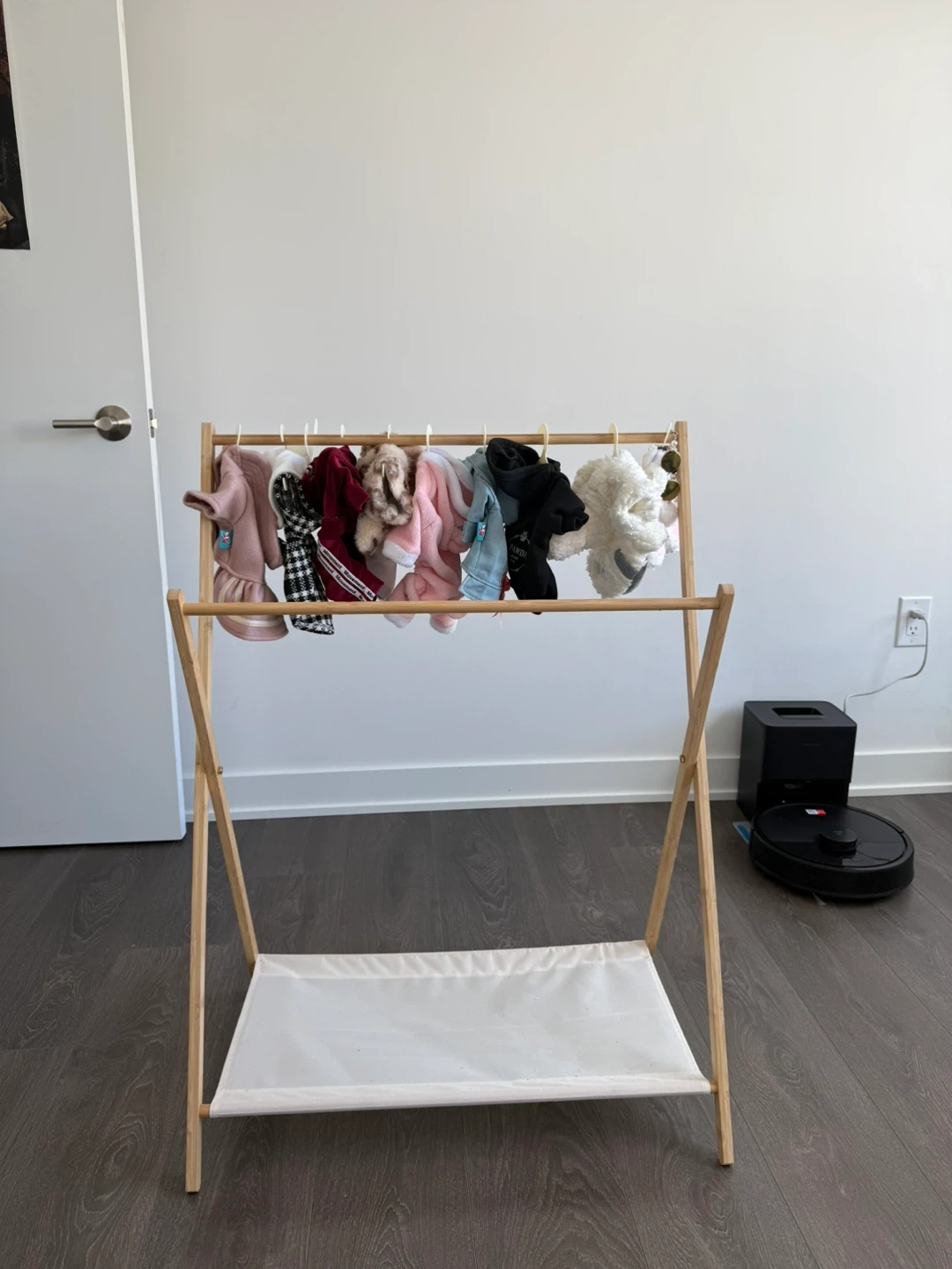 This wooden clothes rack features a simple A-frame design with a fabric basket at the bottom. It's perfect for organizing baby clothes or displaying outfits. The rack is made of light-coloured wood.