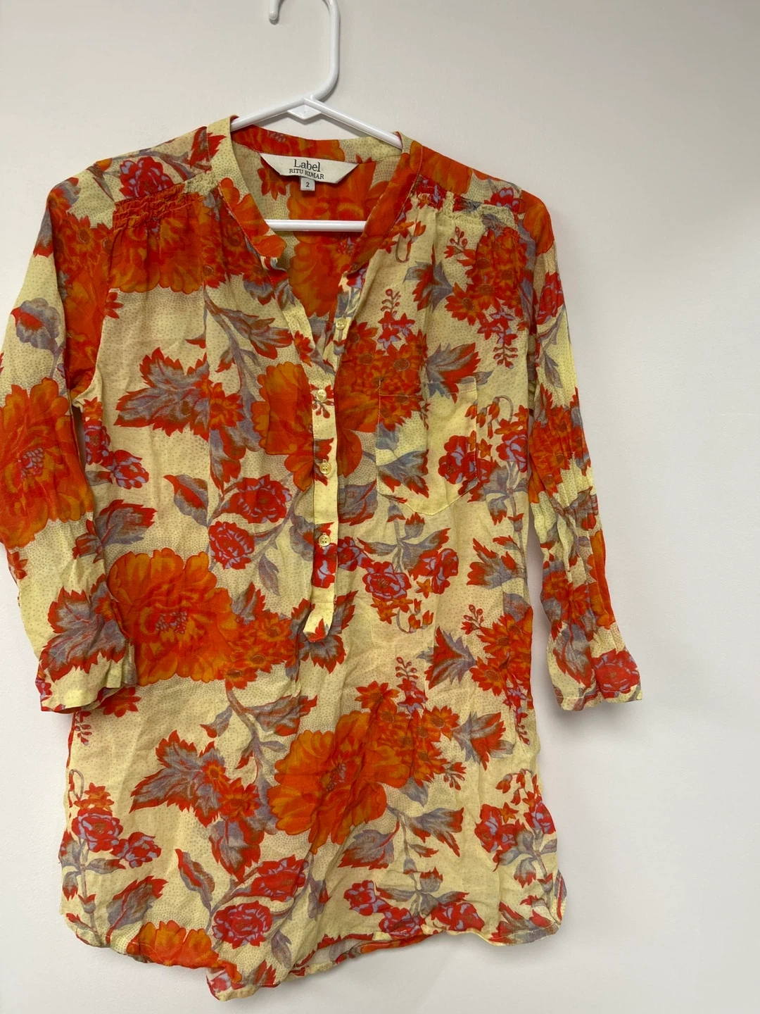 This Label Ritu Kumar blouse features a vibrant floral print with orange, red, and grey hues on a light yellow background. It has a Henley neckline with buttons and 3/4 sleeves. Size is 2.