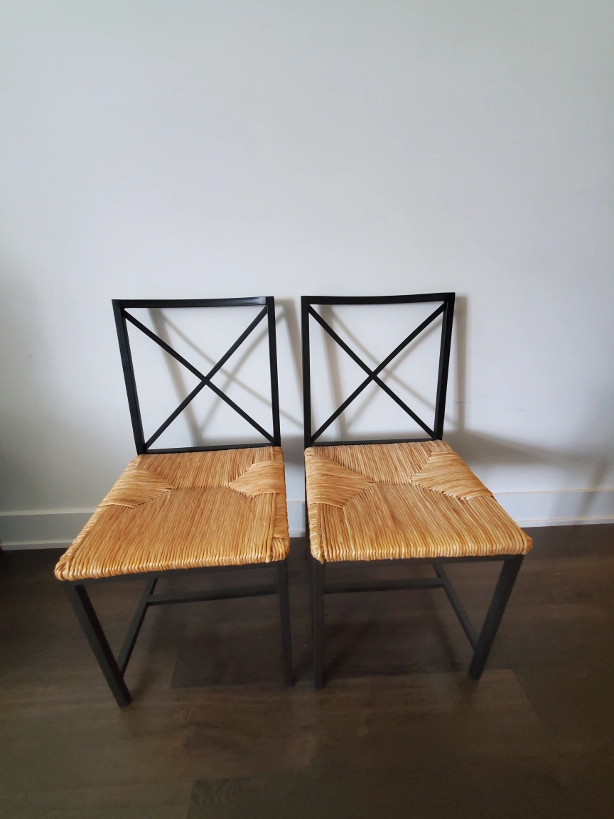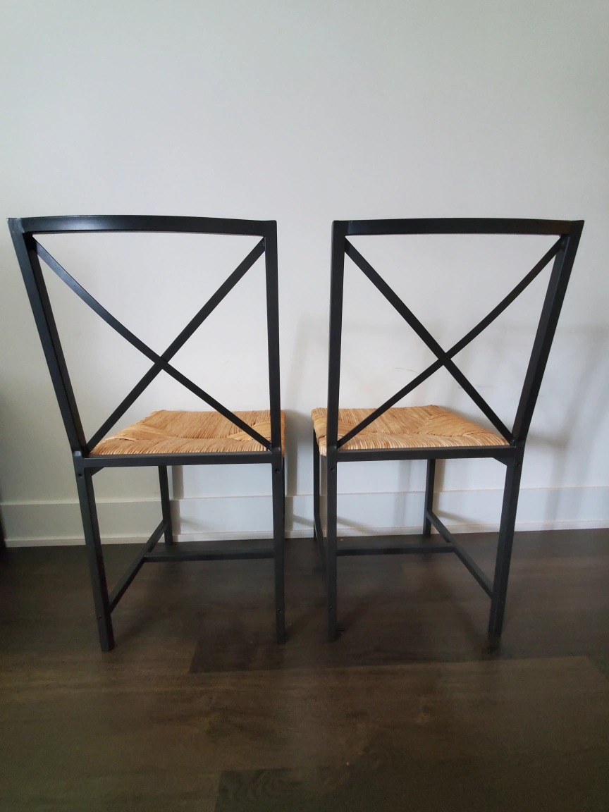 Two dining chairs with black metal frames & rattan seats. In excellent condition.