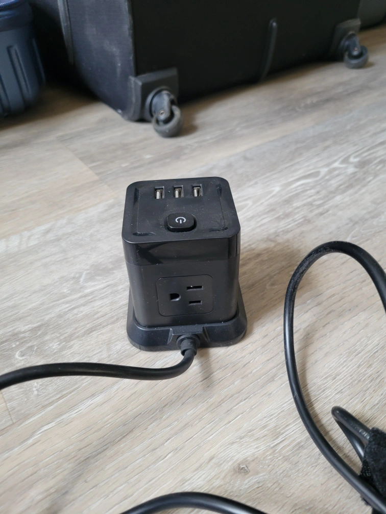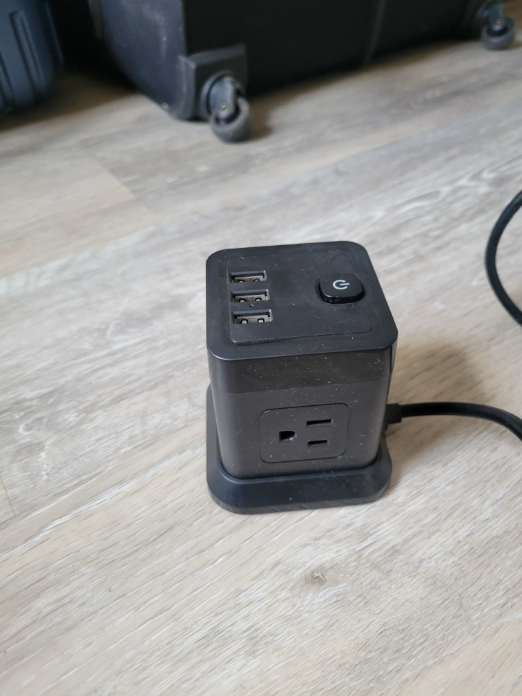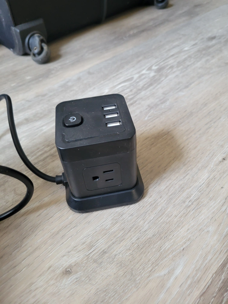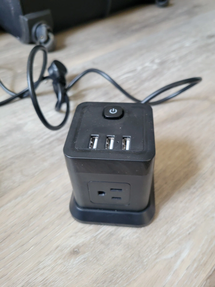 Compact power cube. Features three USB ports and two grounded outlets. Power switch included. Long power cord.