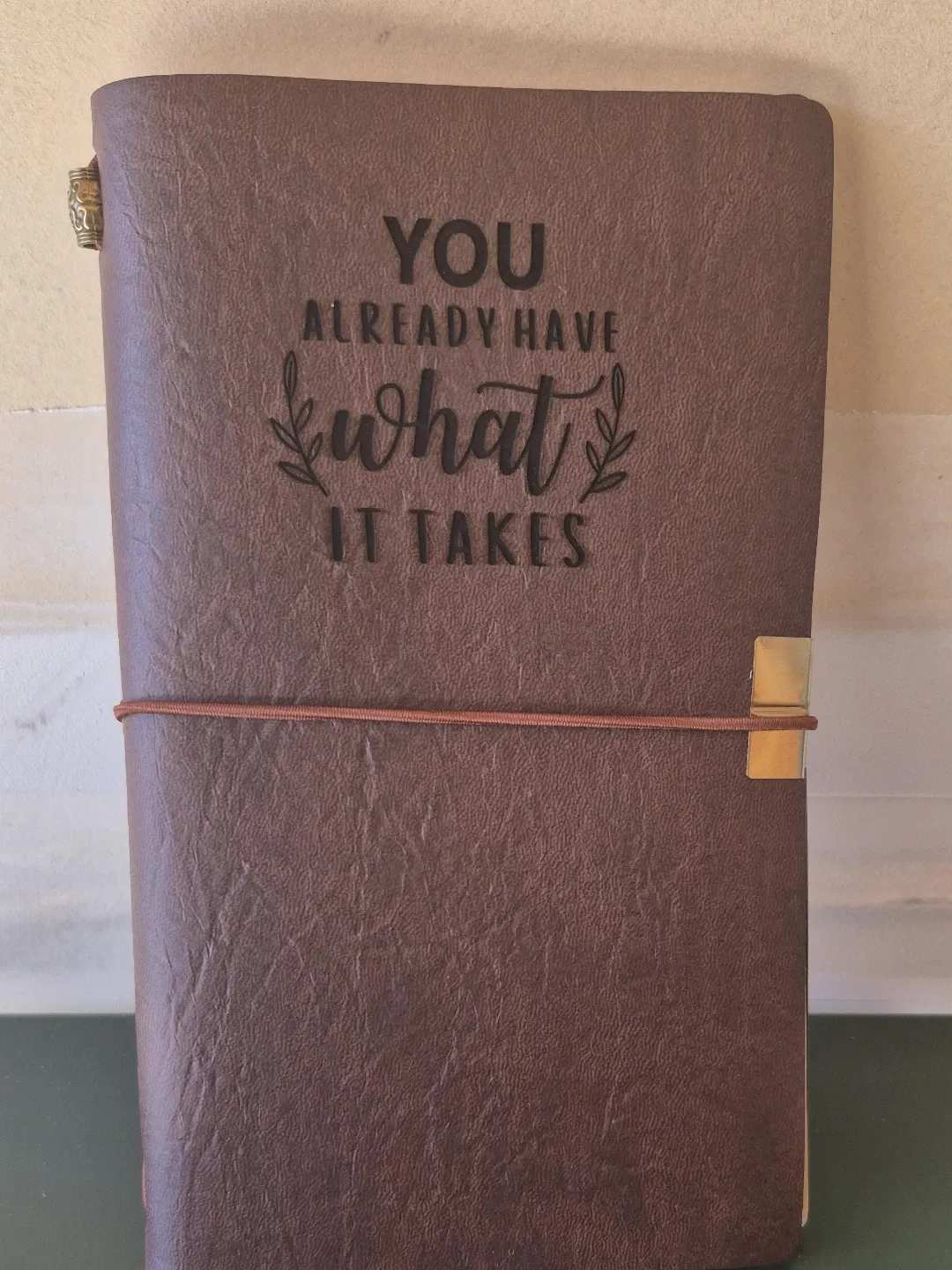 This faux leather journal features the quote 'YOU ALREADY HAVE WHAT IT TAKES' debossed on the cover. It has lined paper inserts and a secure elastic closure. Includes a transparent zippered pouch and card slots.