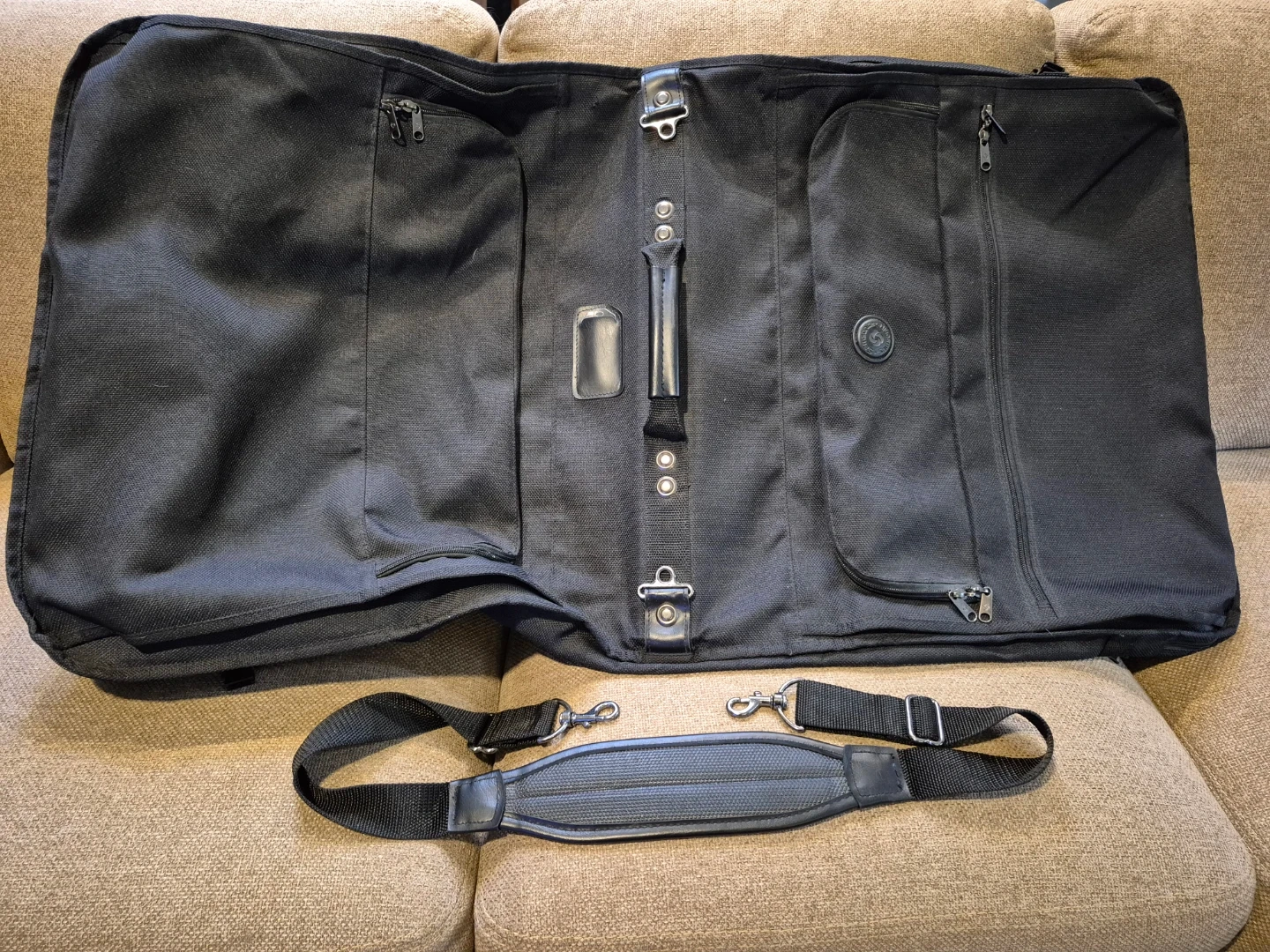 This fully featured garment bag is perfect for transporting business attire virtually wrinkle-free. • Hanger clip and multiple pockets provide exceptional organization. • Removable shoulder strap and podded top carry handle provide comfort in transport. From shoes to shampoo, ties to makeup, there’s a place for everything inside. It includes a hanger handle for easy packing and an extender panel to take care of longer garments. • Interior: hanger-hook bracket; two mesh pockets at top; compression straps; extender panel for longer garments includes mesh and WetPak pockets. • Exterior: 3 zip pockets. • Handles: shoulder strap; carrying handle. With the unisex design, both men and women can travel in style. Also, husband and wife can share one carry on bag if their schedules are not conflicting. With the considerate cross tie and buckles, your suits will be fixed in place, no crease, no wrinkle. Also, other accessories like shirts, belts, shoes are very easy to find in the see-through mesh bag. Your clothes will arrive in perfect condition and always ready to use. Expanded inner compartment is 40” long to hold long garments. Outer clips secure garment bag during flight. Folds flat when not in use. I paid $260 plus tax for it. 20” x 23”. Unfolded 40” x 23”. Completely unfolded: 40” x 46”.