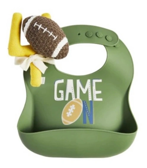 Mud Pie 2-piece set with printed soft silicone bib with front crumb catcher and adjustable neckline closure. Comes with a sweater knit golf putter shaped rattle.