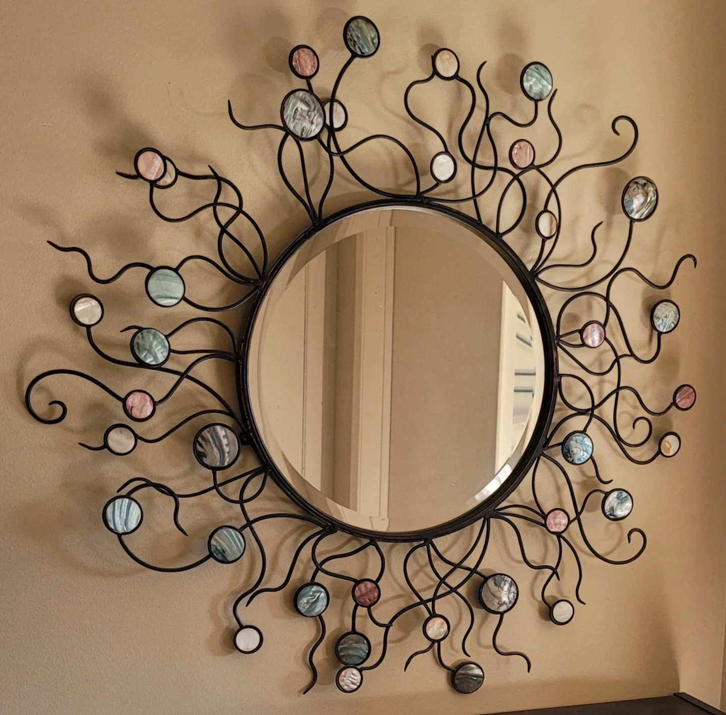 This unique sunburst mirror features a black metal frame adorned with colourful glass or shell accents. It's a lovely statement piece for any room! The frame is made of metal and has a decorative metalwork design.