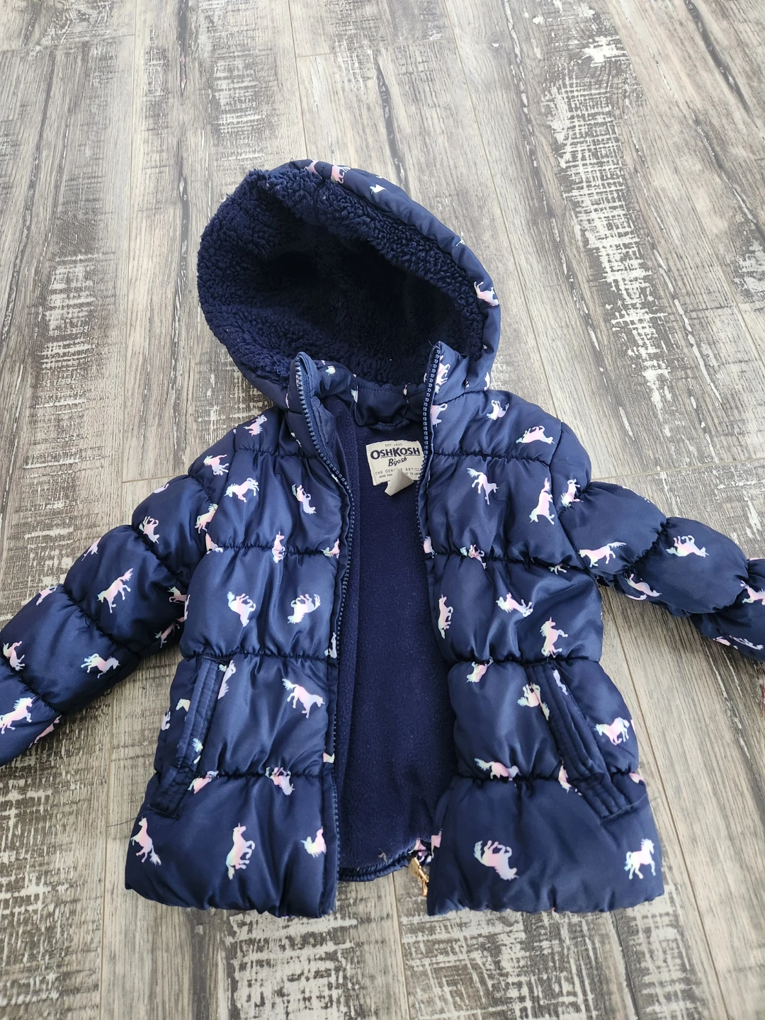 Here's a cute OshKosh B'gosh puffer jacket for your little one! It features a fun unicorn print and is a size 3T. It's in great condition and ready to keep your kiddo warm and stylish this season