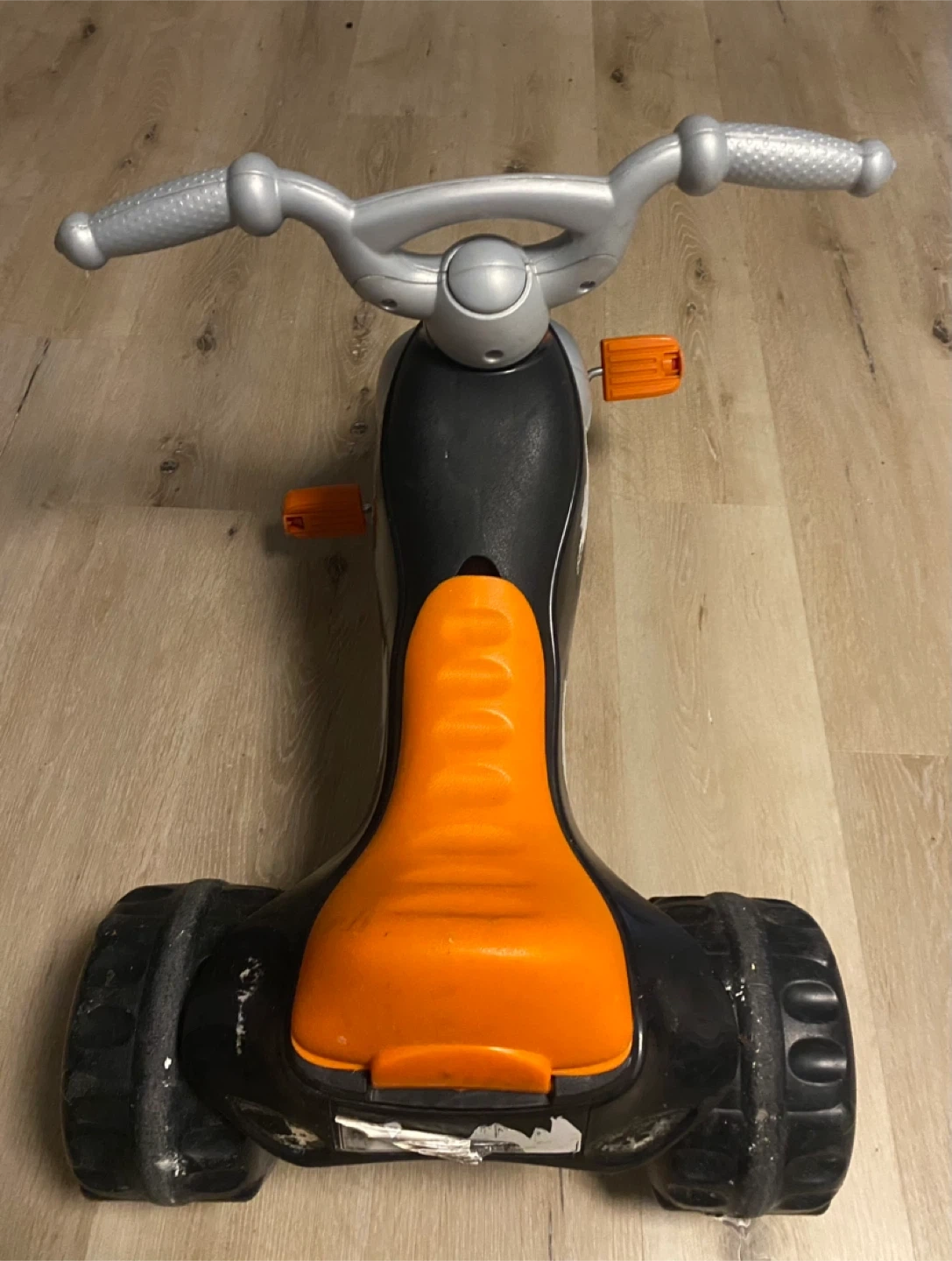 Orange & Black “Little Tikes” toddler trike in used condition. It has an orange seat that lifts up and has a little hiding place for toys! This trike is perfect for little ones learning to ride!