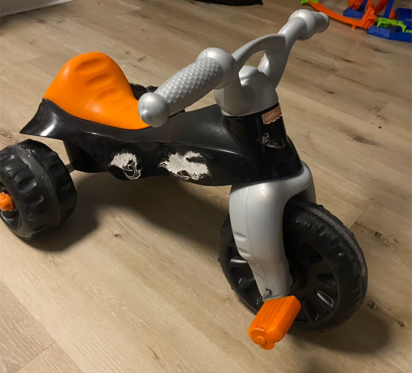 Orange & Black “Little Tikes” toddler trike in used condition. It has an orange seat that lifts up and has a little hiding place for toys! This trike is perfect for little ones learning to ride!