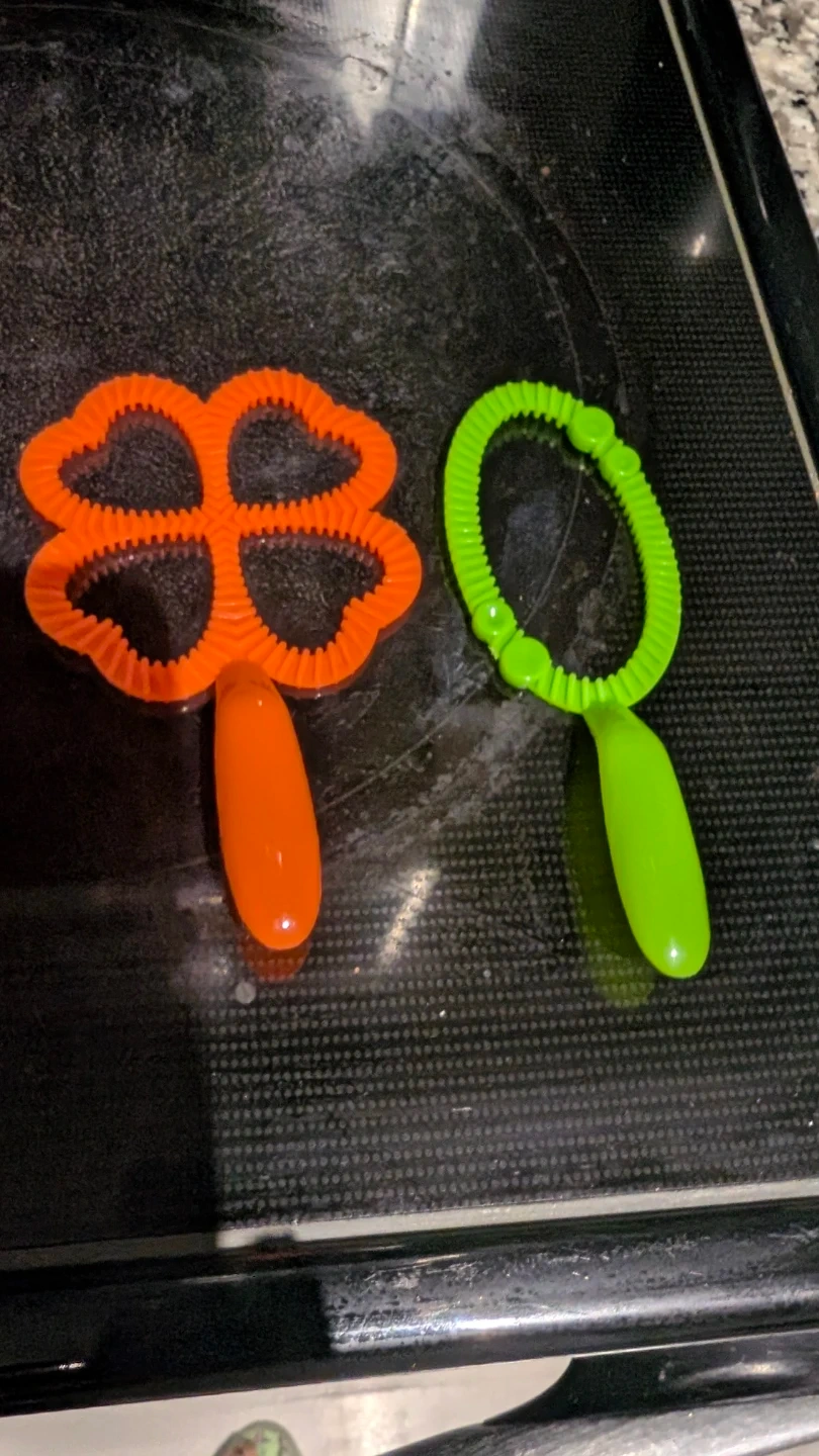 This set includes two plastic bubble wands. One is orange with a clover shape and the other is green with a circular shape. They're fun for outdoor play!