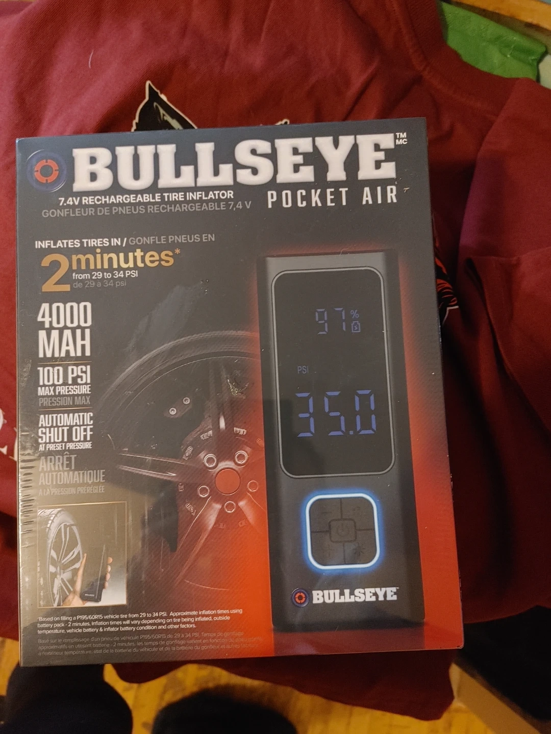 This Bullseye 7.4V rechargeable tire inflator is compact and portable. It inflates tires from 29 to 34 PSI in approximately 2 minutes. It has a 4000 mAh battery and a max pressure of 100 PSI.