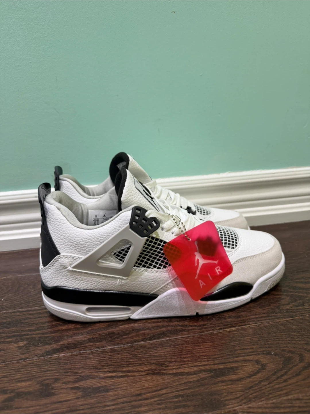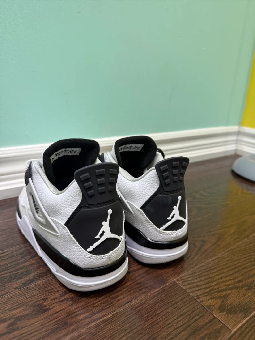 These are toddler Air Jordan 4 Retro shoes in white, black, and grey. Features classic Jordan branding on the heel and tongue. Perfect for young sneaker fans!