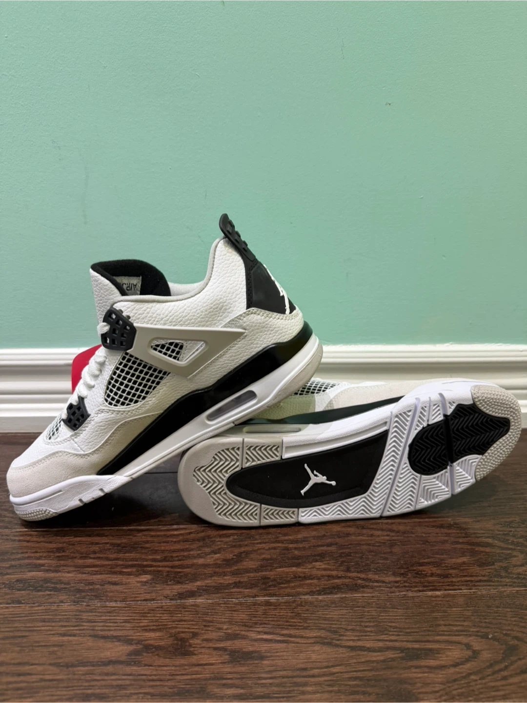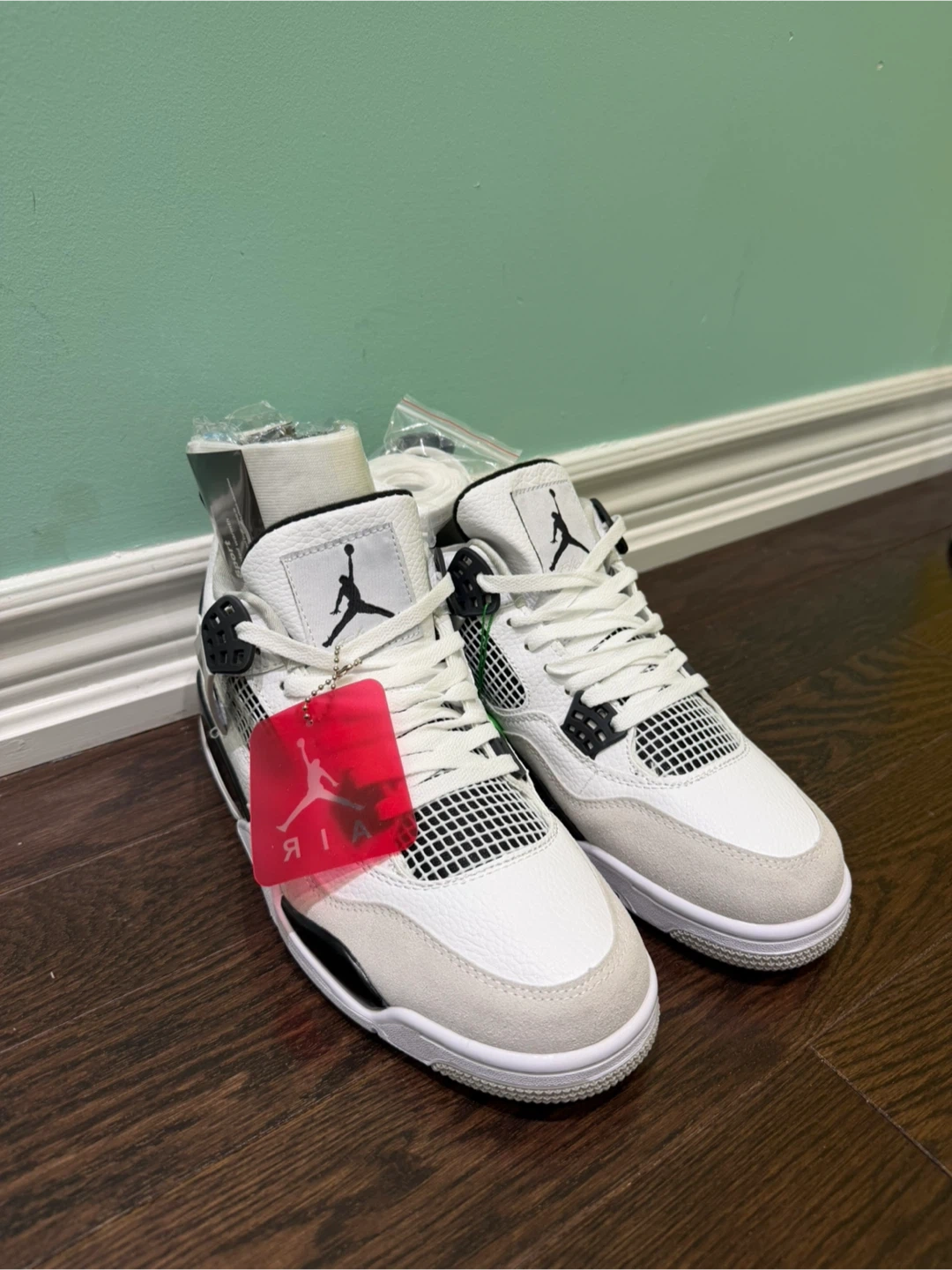 These are toddler Air Jordan 4 Retro shoes in white, black, and grey. Features classic Jordan branding on the heel and tongue. Perfect for young sneaker fans!