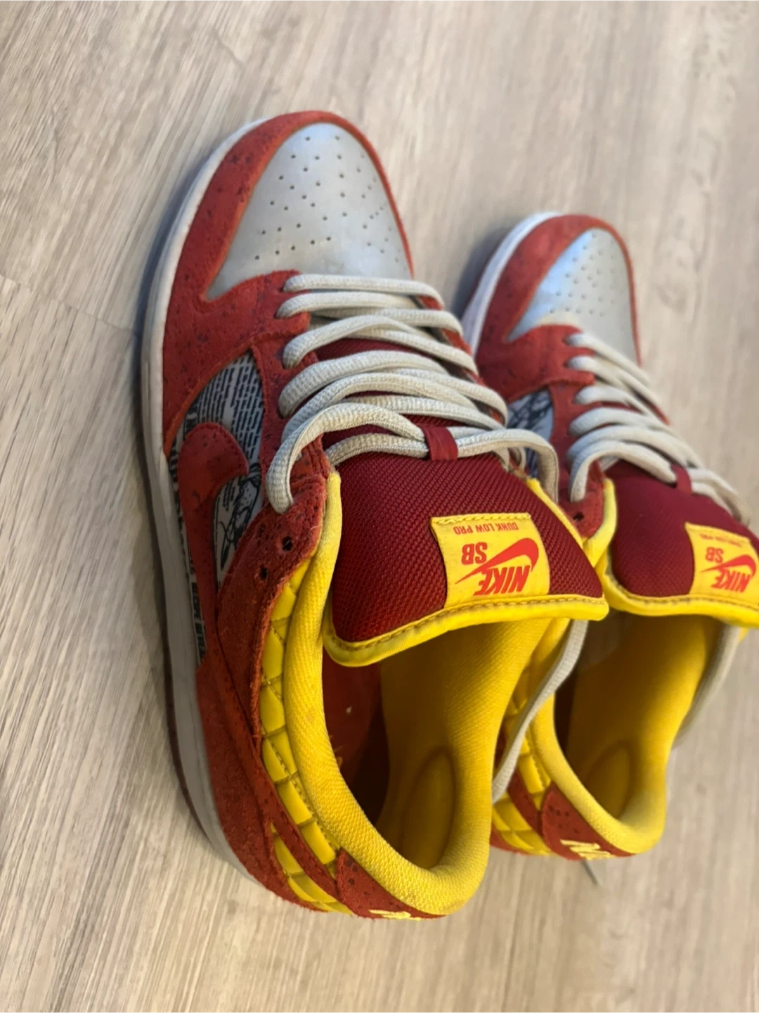 These are Nike SB Dunk Low sneakers in a red and yellow colourway, officially known as the "Rukus Crawfish" special edition. They're a men's size 10 and were made in Vietnam. These shoes feature a unique design with newspaper-style print accents.