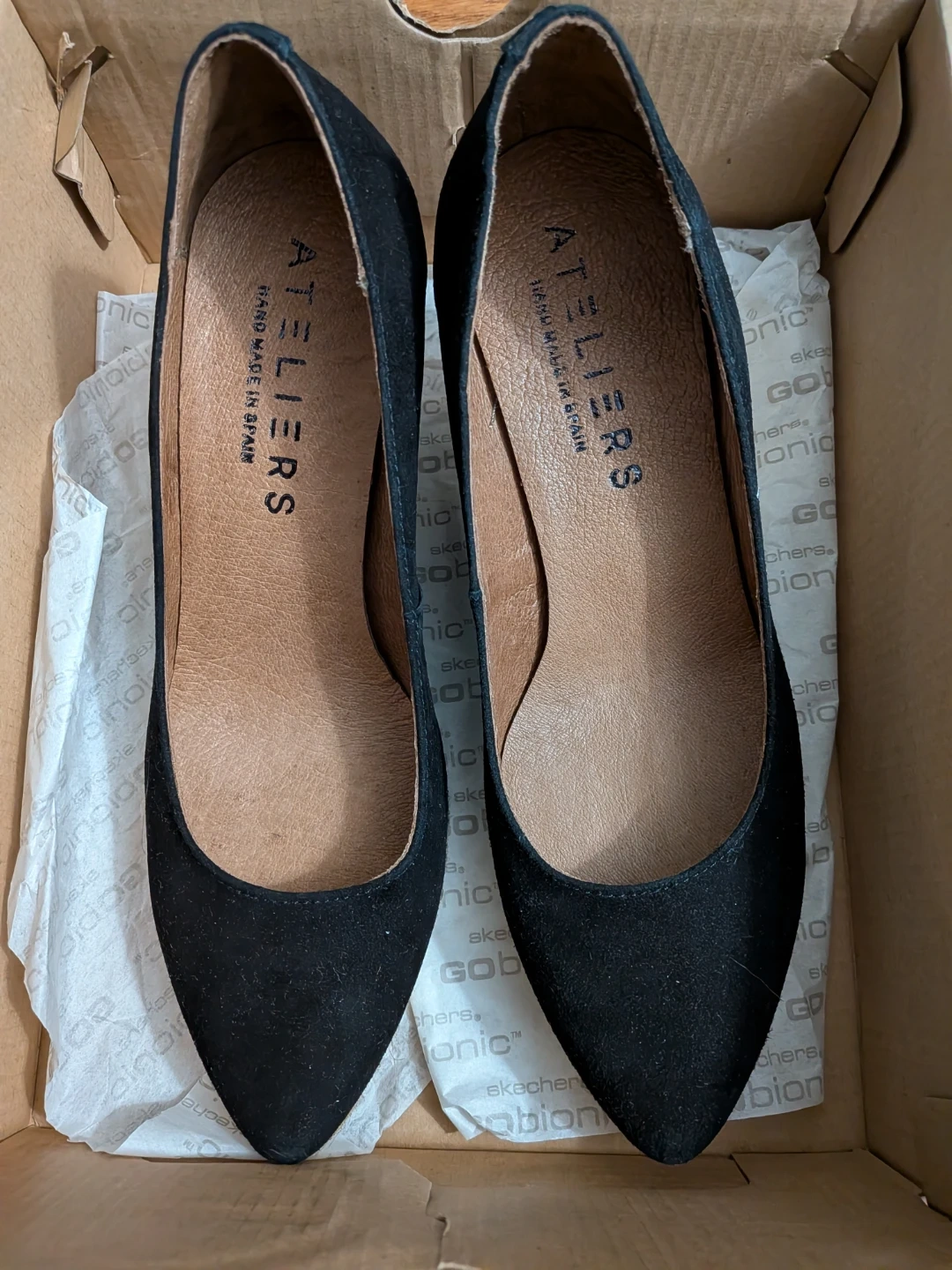 These black wedge heels from ATELIERS are handmade in Spain. They feature a suede upper with a jute-wrapped wedge heel. Perfect for adding a touch of style to any outfit! Size 36 or size 5.5/6