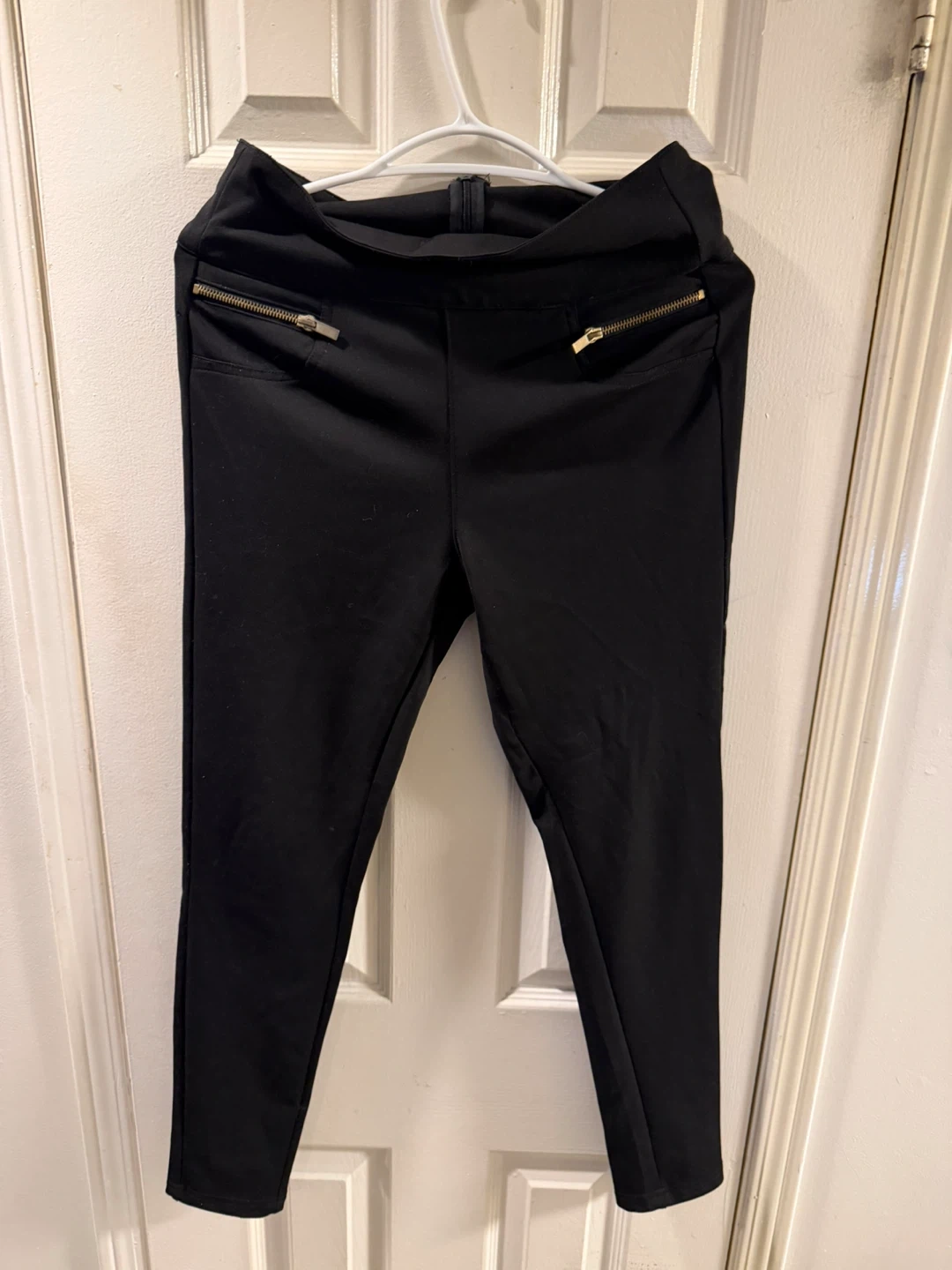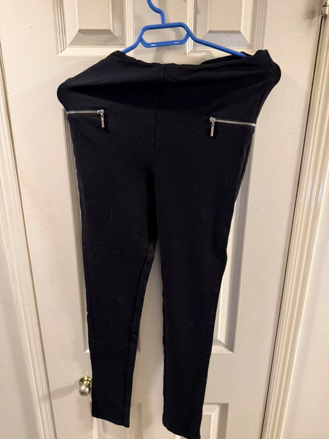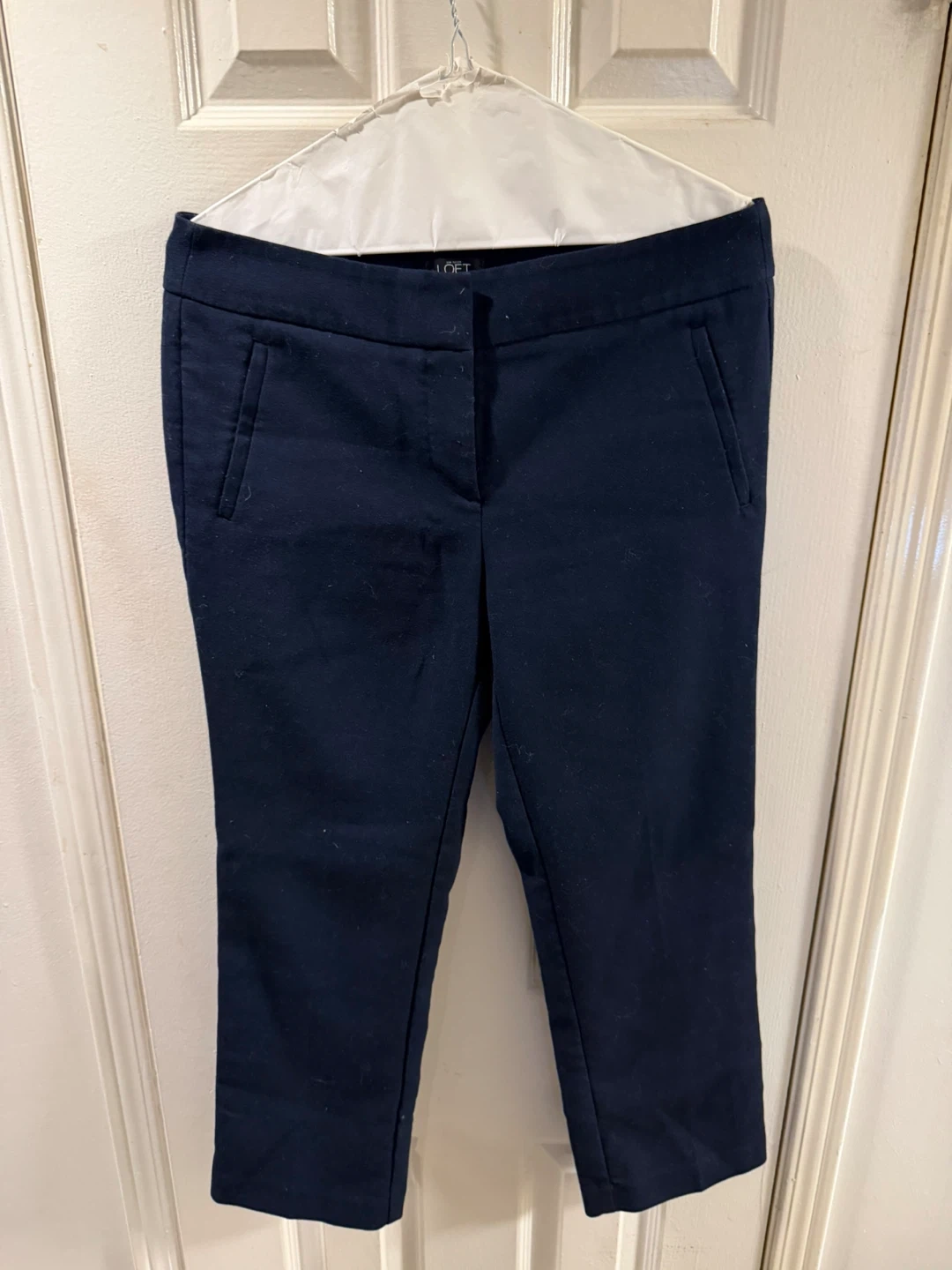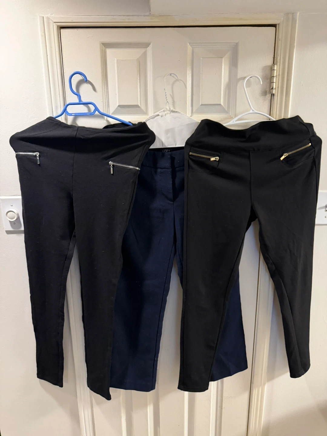 A bundle of two black pull-on pants with zip pockets and one navy pair of trousers. The black pants appear to be a stretchy material. The navy trousers are from LOFT.