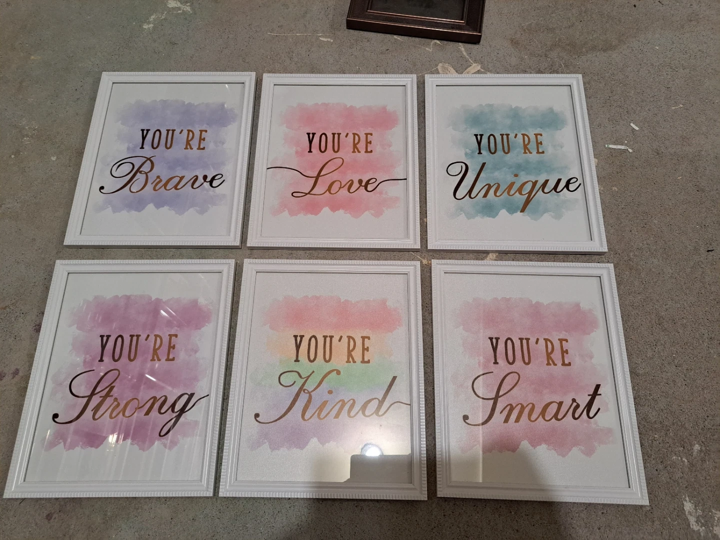 I have a set of six framed prints with inspirational words. All framed in 8x11 frames and ready to hang.All printed on canvas.