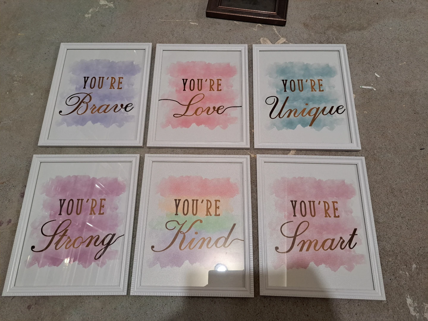 I have a set of six framed prints with inspirational words. All framed in 8x11 frames and ready to hang.All printed on canvas.