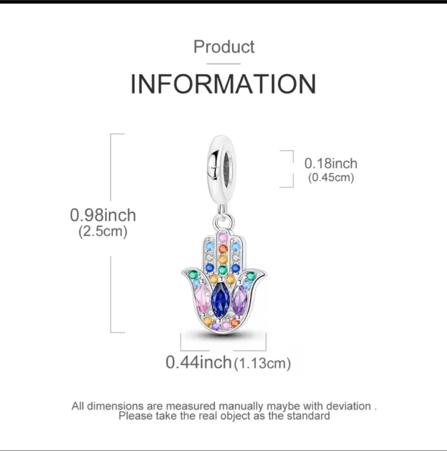 🥕This Hamsa hand charm bead features colourful cubic zirconia stones set in sterling silver. It's designed to fit standard charm bracelets. The bead measures 0.98 inches (2.5cm) in length and 0.44 inches (1.13cm) wide. A great way to add a pop of colour and protection to your jewellery collection!🥕