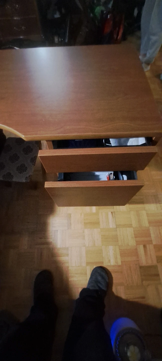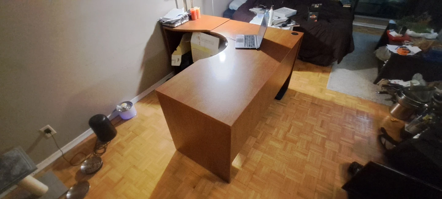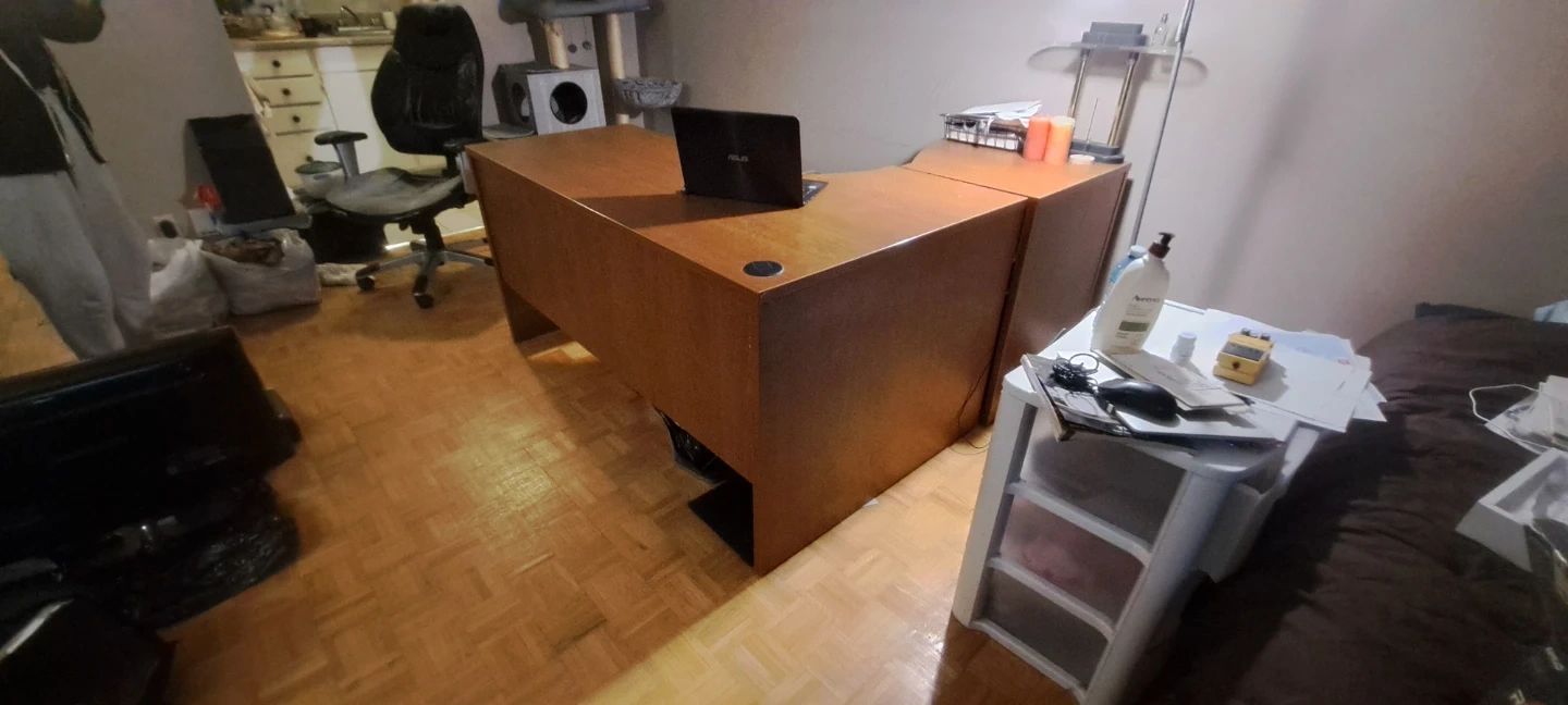 Selling a sturdy wooden L-shaped corner desk. It has a warm, natural finish that would look great . The desk features drawers for storage and a spacious work surface. Perfect for maximizing space in your room!