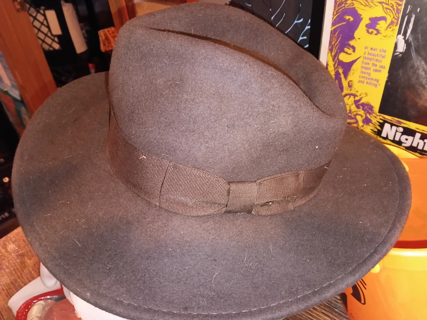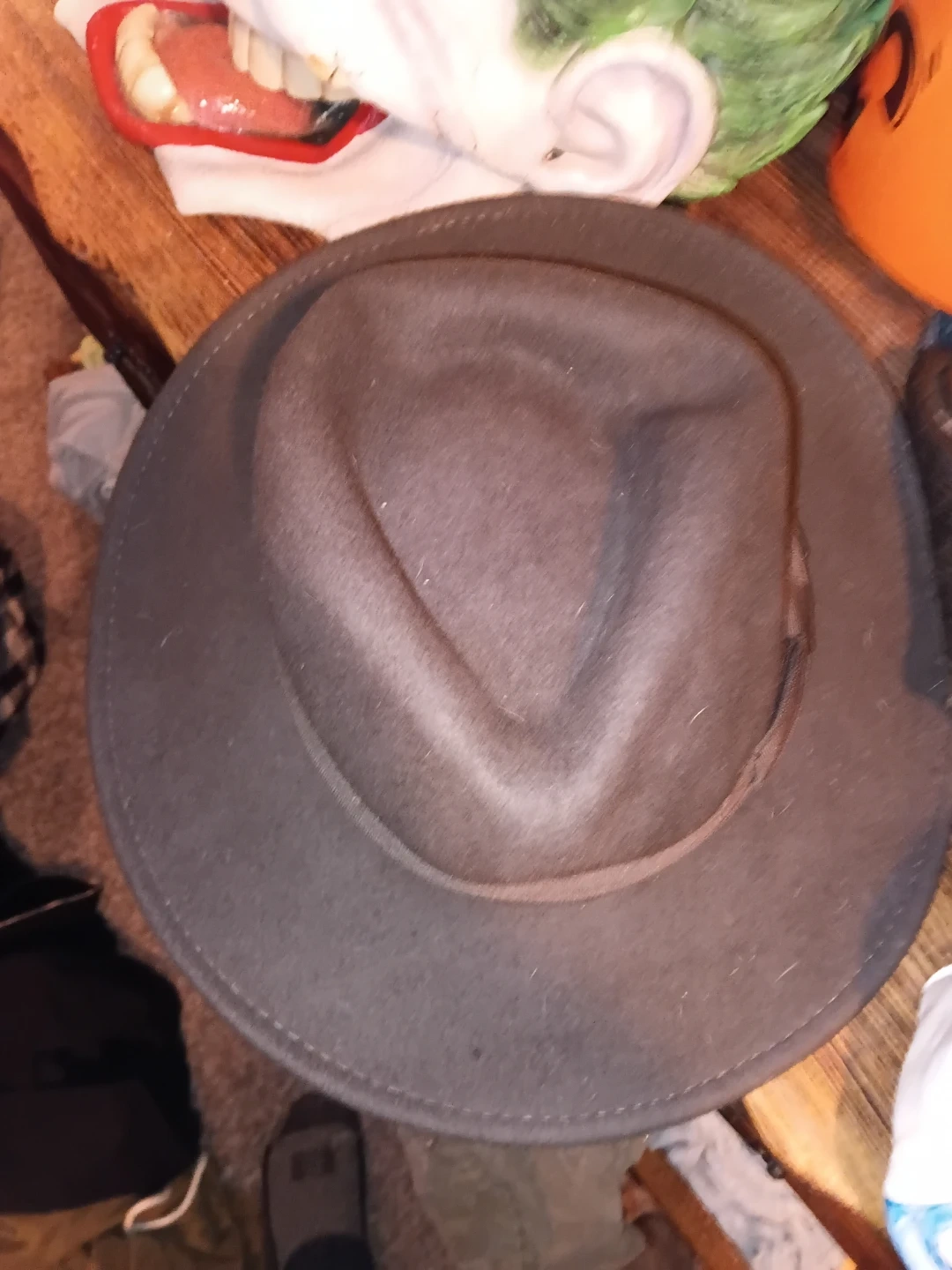 A classic brown fedora hat with a grosgrain ribbon band. It's made of felt material and has a timeless design. This hat is great for completing a vintage or stylish outfit.