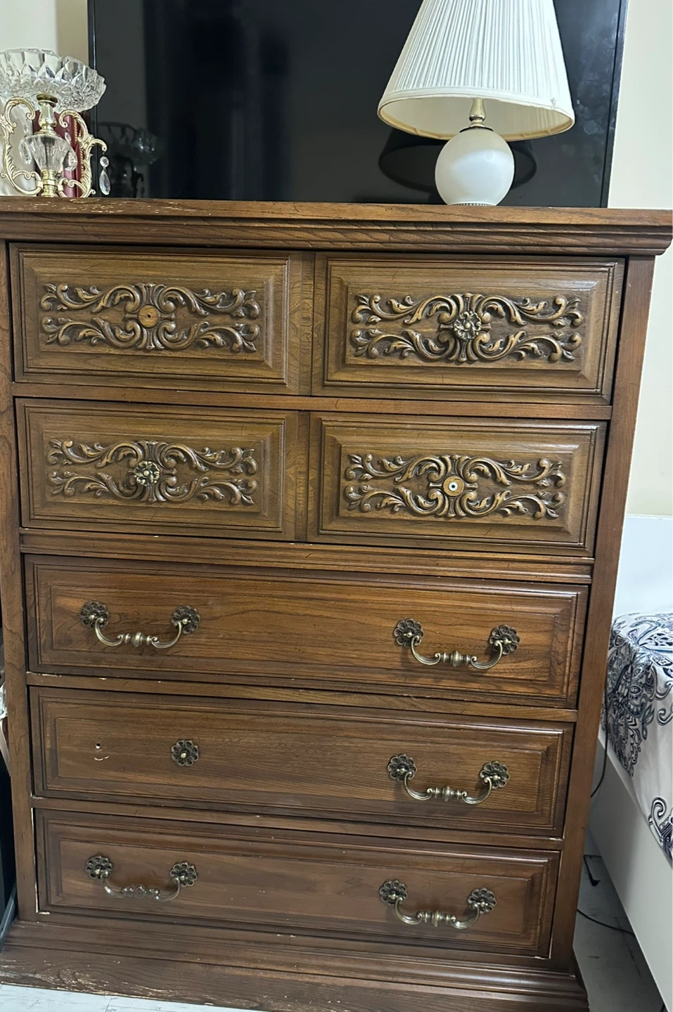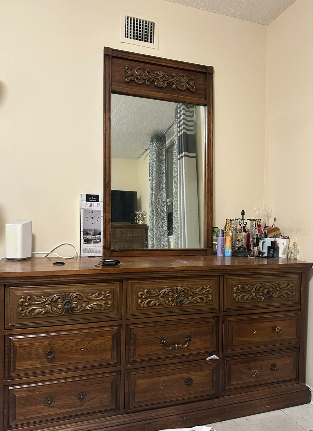 A lovely vintage dresser crafted from solid wood with ornate detailing on the drawers and an attached mirror. It features multiple drawers for ample storage. This piece adds a touch of classic elegance to any bedroom. It's perfect for storing clothes and accessories.