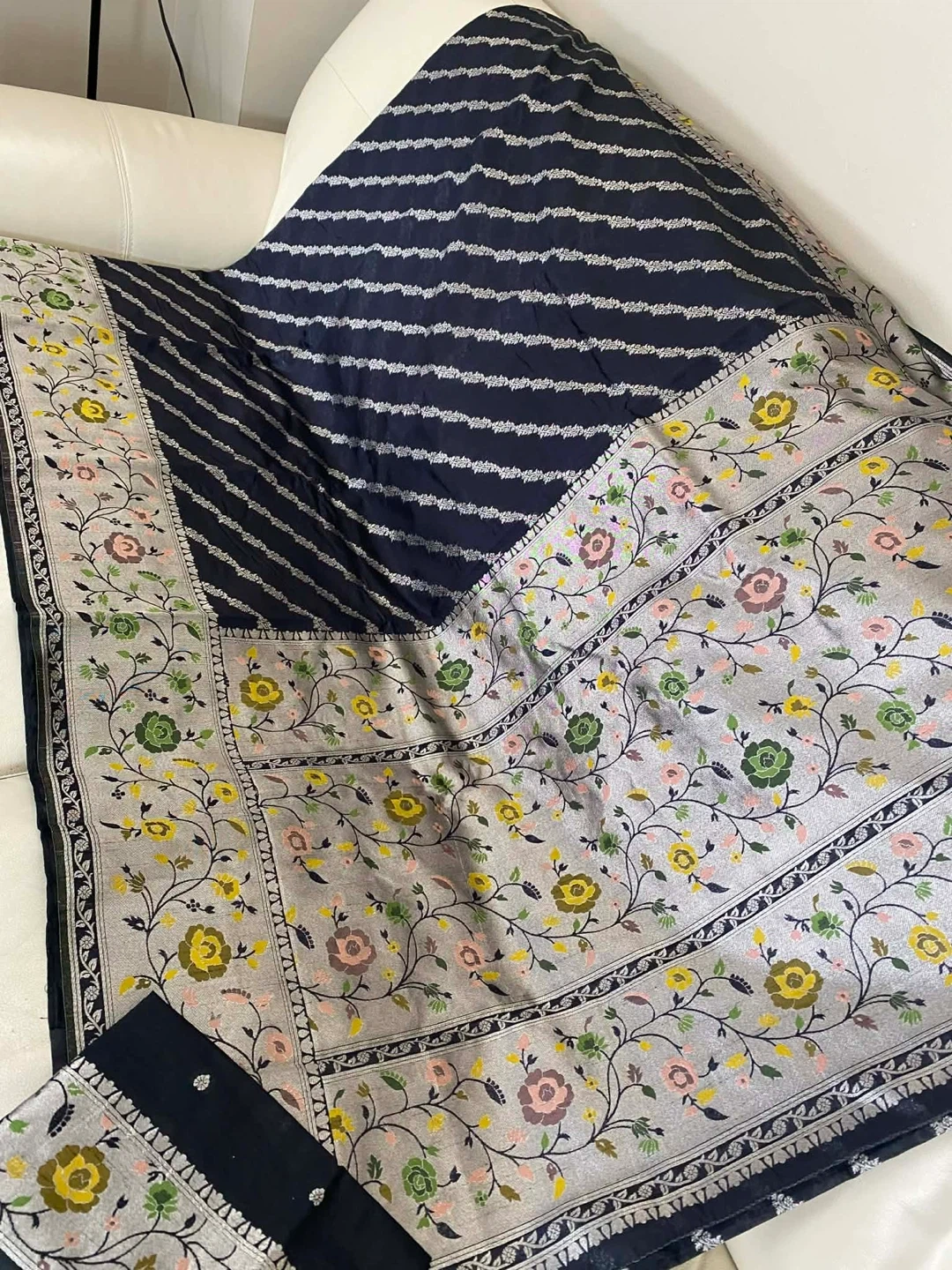 Brand new Beautiful black saree featuring horizontal silver stripes. It has a wide border with a grey background and a vibrant floral pattern in shades of yellow, pink, and green. Includes a matching unstitched blouse piece.
