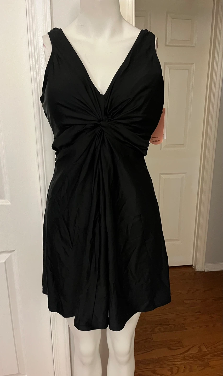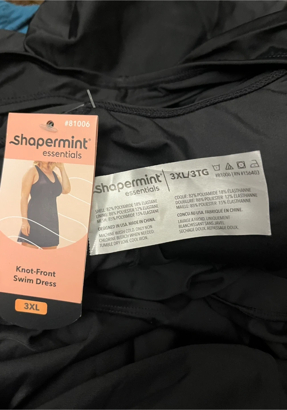 This Shapermint Essentials knot-front swim dress comes in black and size 3XL one piece It's made of 82% polyamide and 18% elastane for the shell, with a lining of 88% polyester and 12% elastane. Machine wash cold, use only non-chlorine bleach if needed, and tumble dry low. It's designed in the USA and made in China.