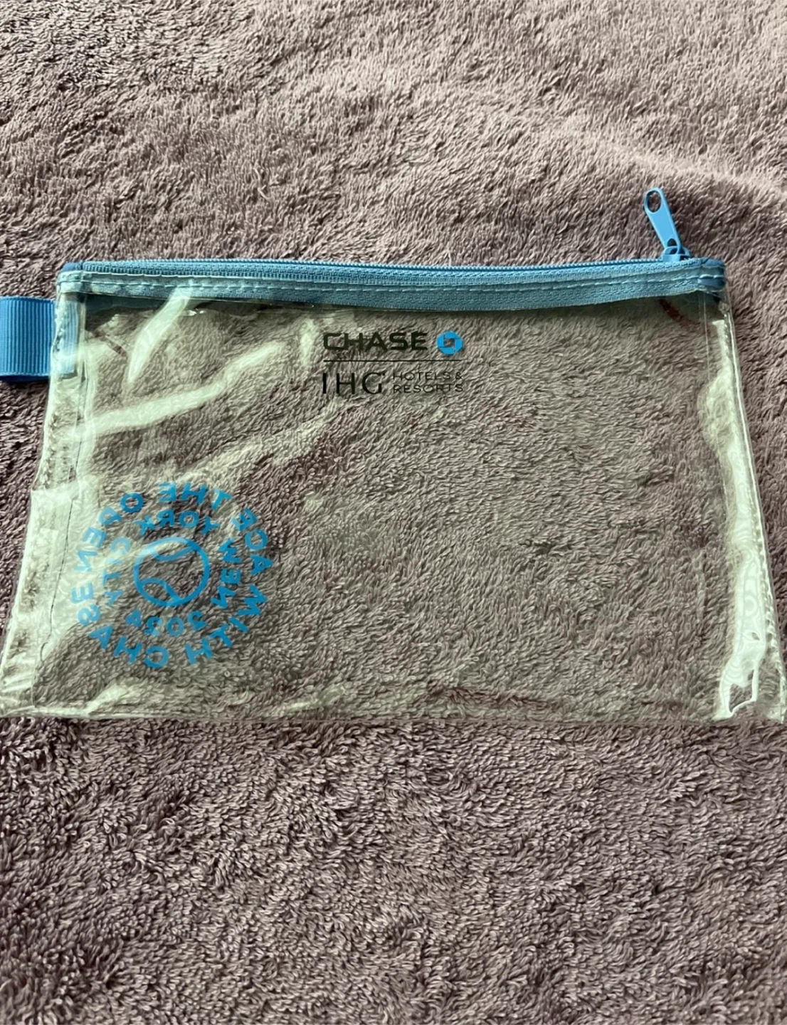 This clear zippered pouch features "The Open" logo and "Chase The Open with Chase" branding. It's made of transparent plastic with a light blue zipper and loop. Perfect for carrying small essentials on the go!