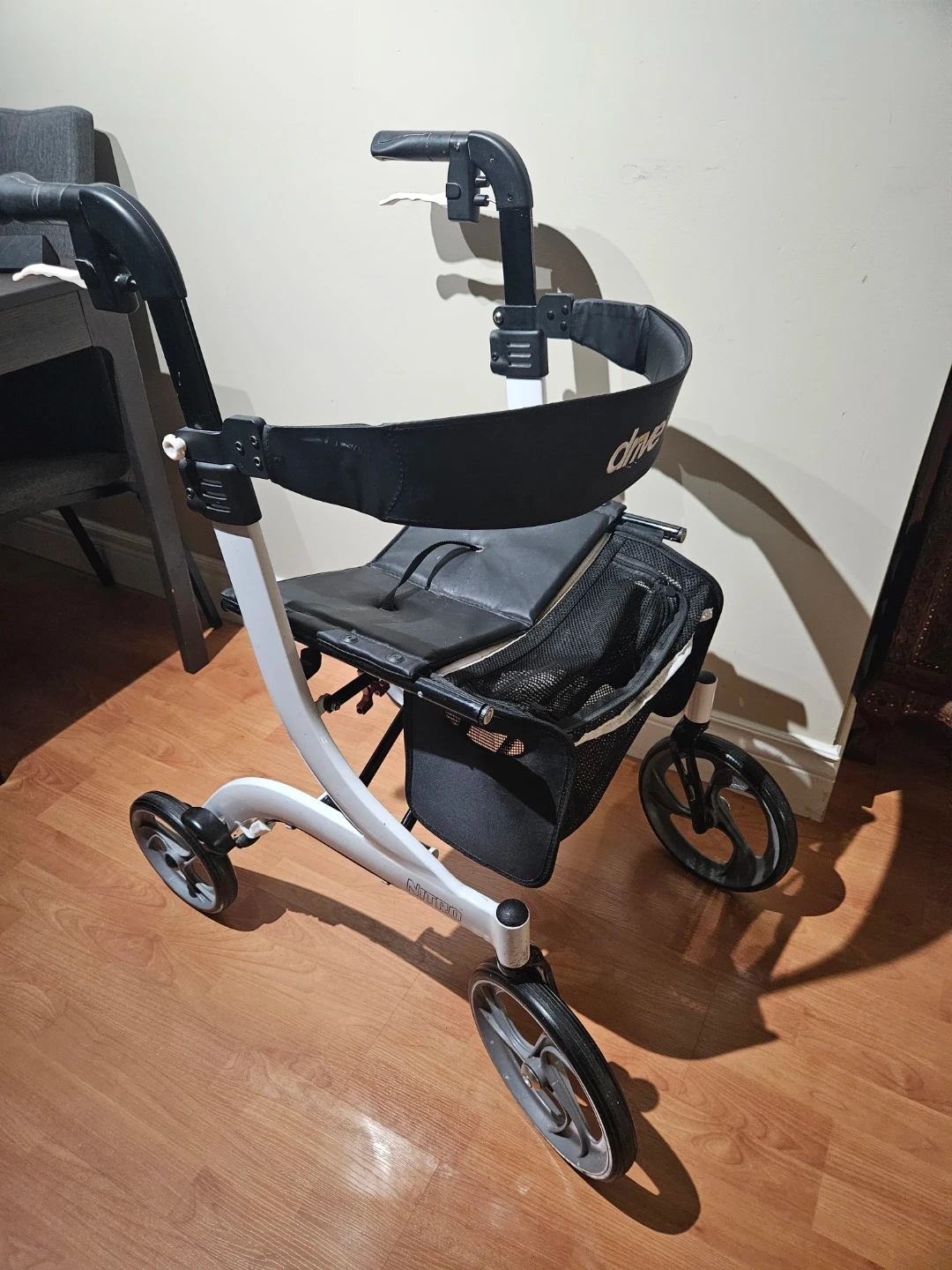 This white Drive Nitro rollator walker is a great mobility aid. It comes with a black seat and storage basket. Its lightweight design makes it easy to manoeuvre indoors and outdoors.