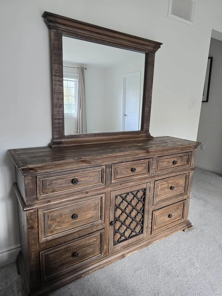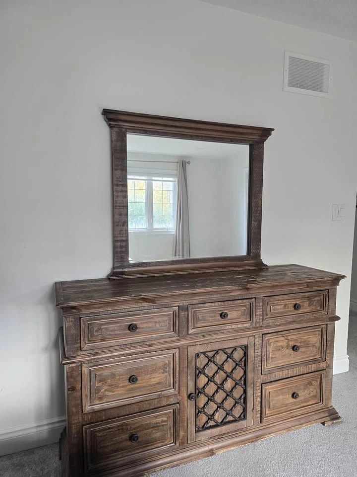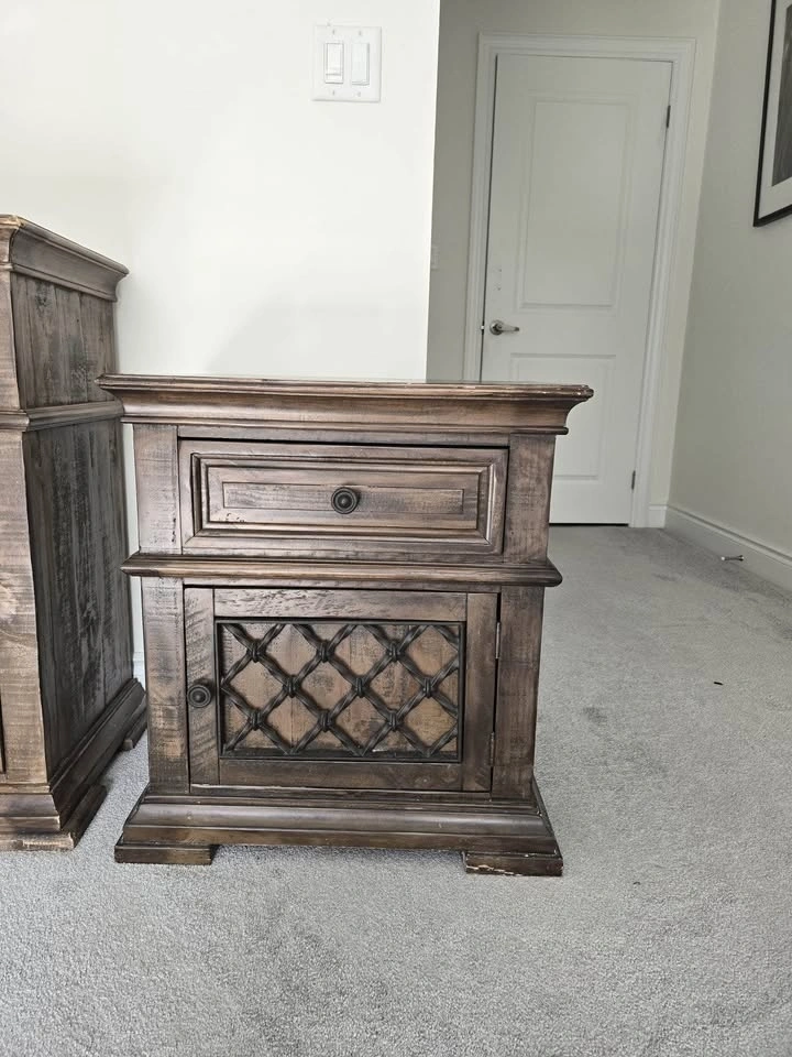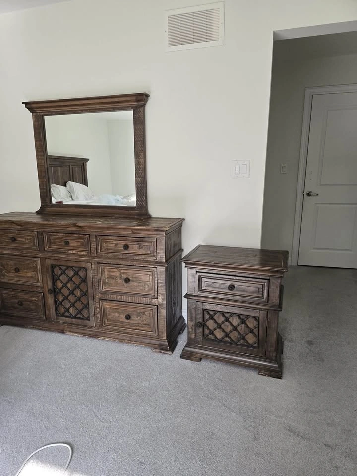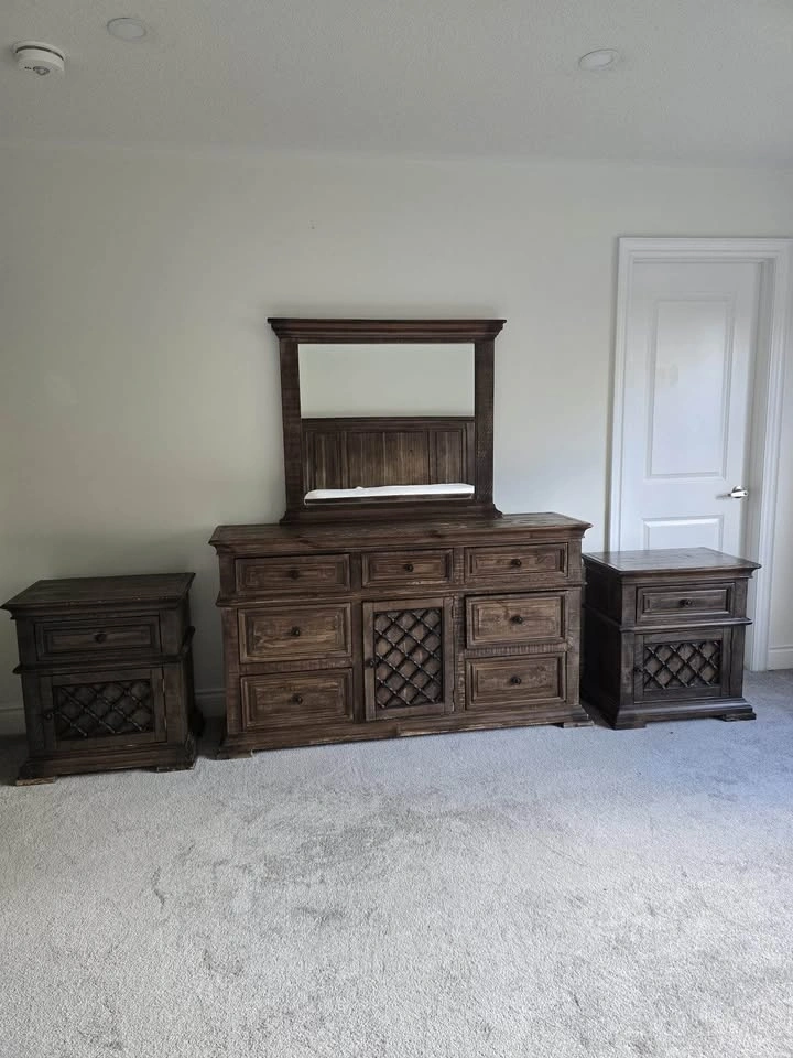 Clean, high-quality bedroom set in great condition. Includes: Large dresser with mirror, 2 matching nightstands. Dresser without mirror 60βx35βx15β. Mirror: 38βx34β. Nightstands 24βx27βx15β (LxHxW). Rich dark wood finish with detailed craftsmanship β sturdy, not cheap MDF. Plenty of storage and built to last. Gently used, no major damage. $350 (open to reasonable offers). Pickup: Mayfield and McLaughlin.