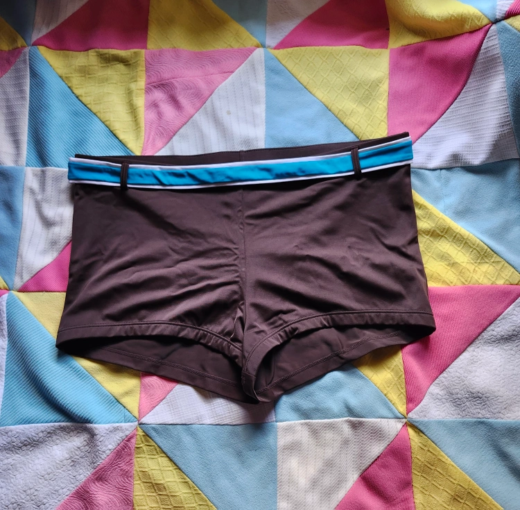 aborable y2k brown boyshort cut swim bottoms. the belt part sadly doesn't go all the way around, it is just a piece at the front