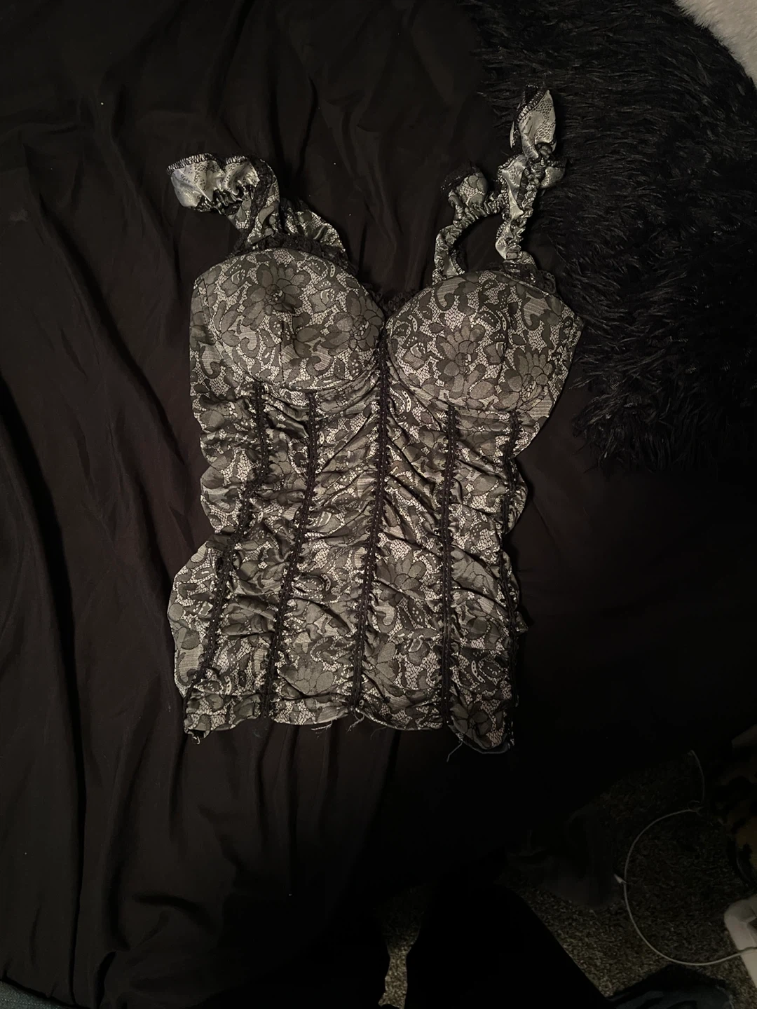 Grey lace corset top with ruffled straps and ruched detailing. Lace overlay on a satin-like base. It's a stylish piece for layering or wearing on its own! Has boning for structure.