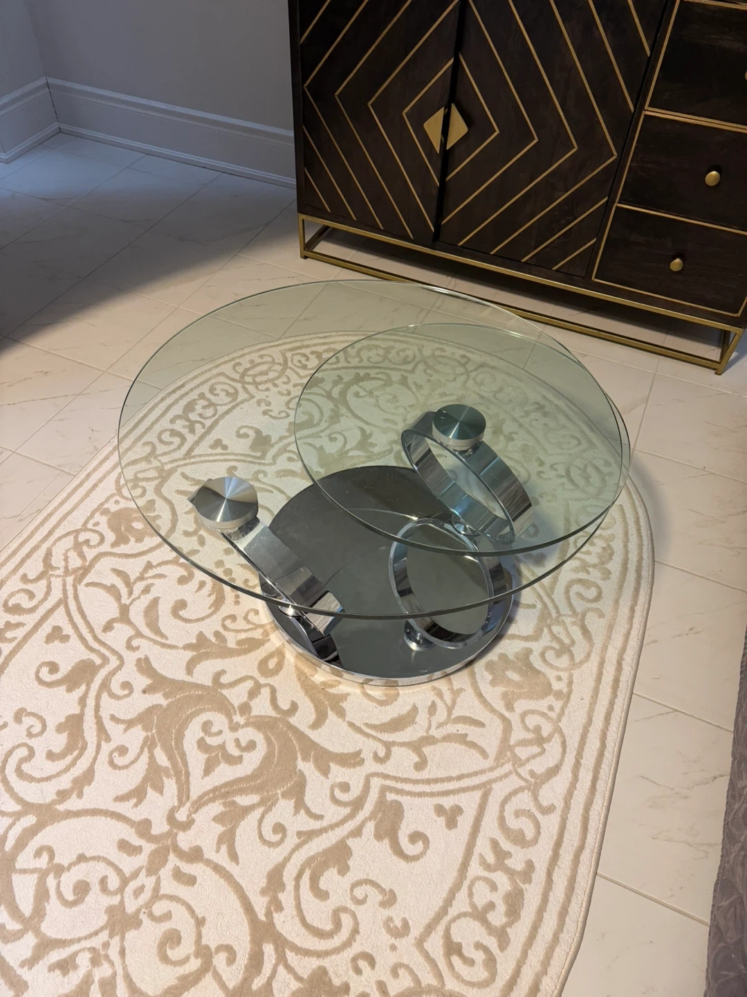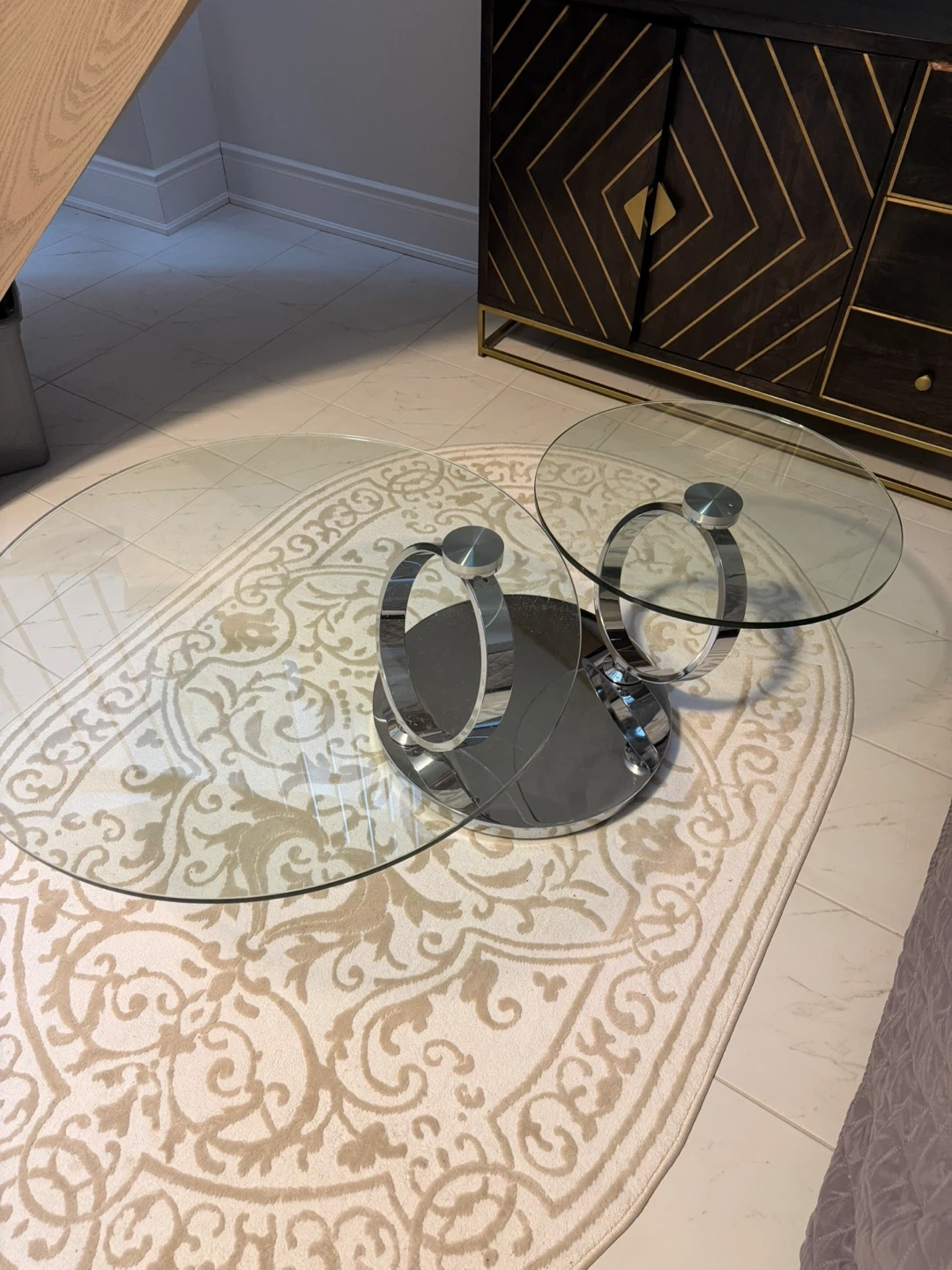 This stylish coffee table features a unique modern design with clear glass tops and a gleaming chrome base. It's perfect for a contemporary living room.