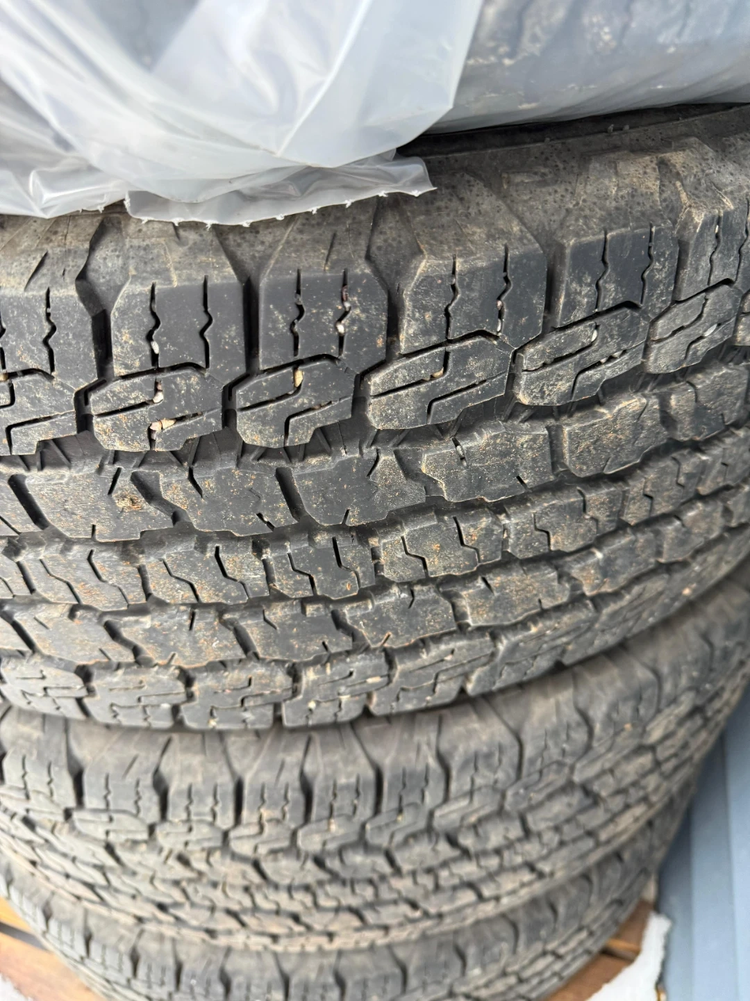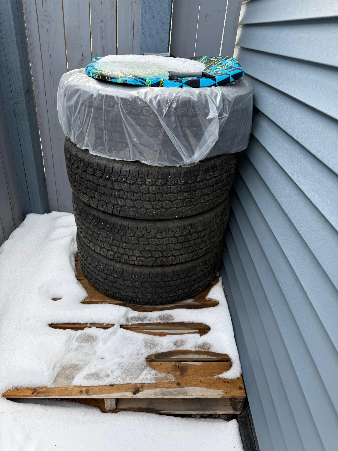 Four used tires for sale. Tread depth is comparable to a Canadian quarter. Great for off-season use or a project vehicle. All tires are black.