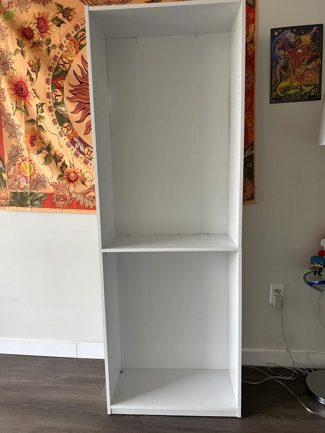 A white, tall bookshelf with two shelves. It's perfect for storing books or displaying decor. White particleboard construction.