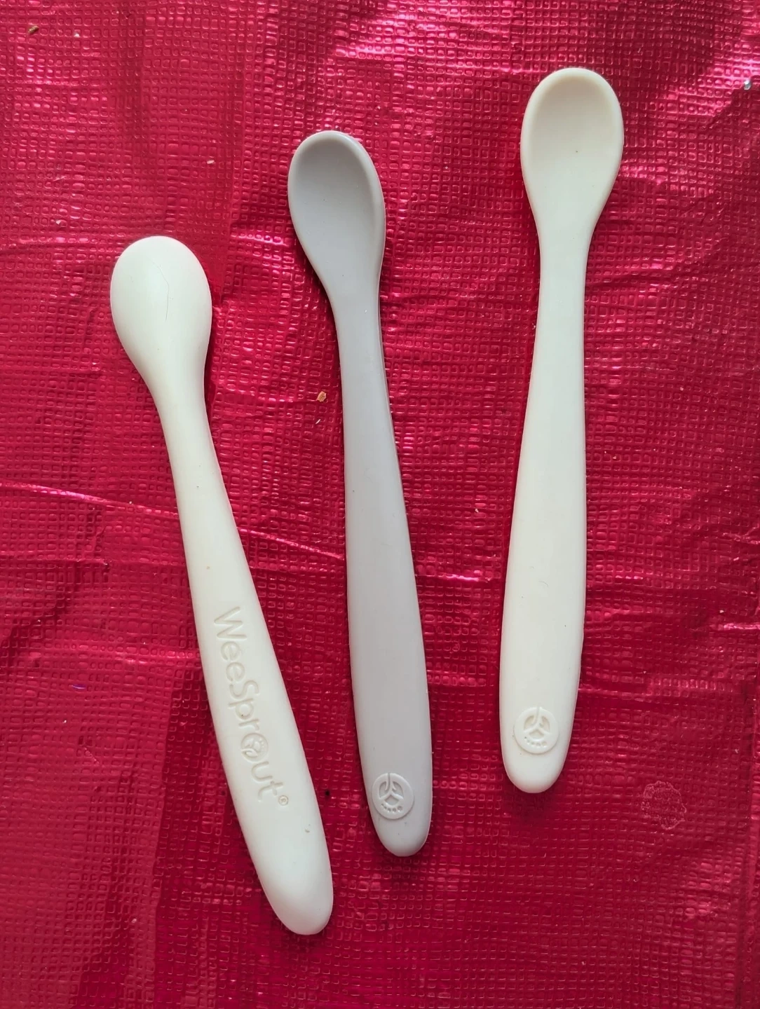 Set of three WeeSprout baby spoons. Made from silicone. Includes one grey and two off-white spoons. Useful for starting solids.