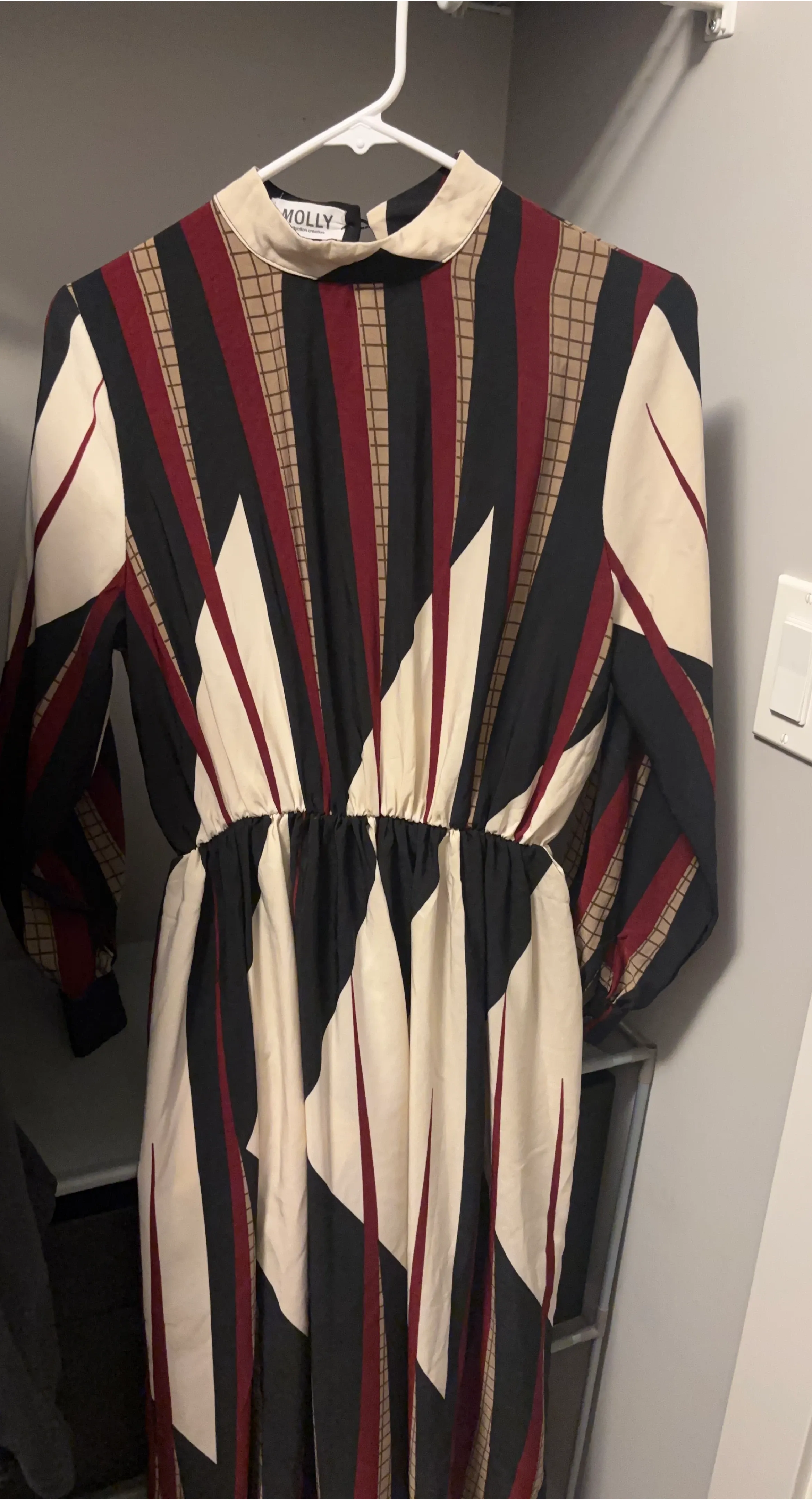 This is a vintage dress from Molly. It features a bold geometric print with striking vertical lines and a plaid accent. The dress has a cinched waist and long sleeves, giving it a flattering silhouette. It's perfect for a retro-inspired look!