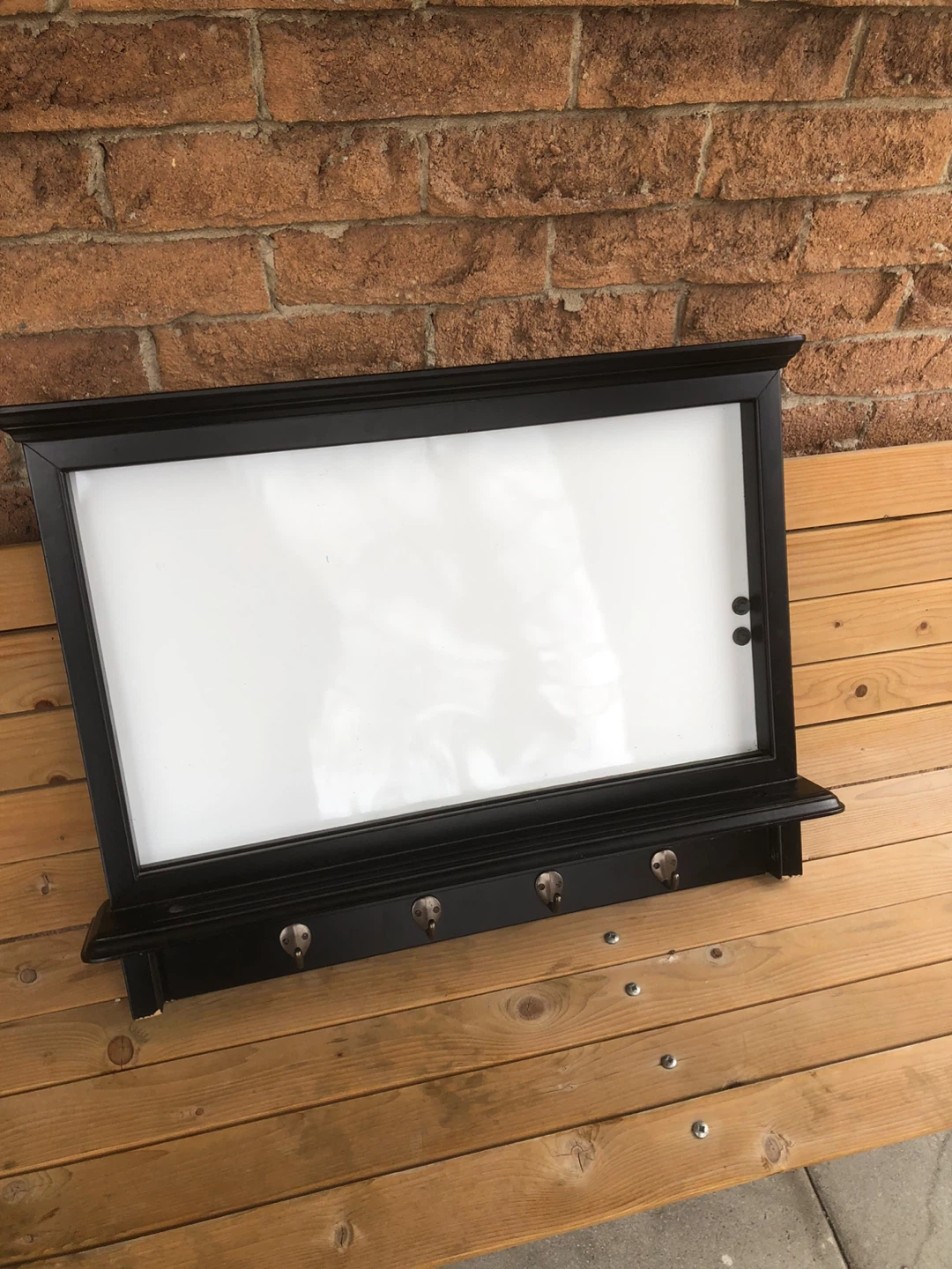Selling a black framed whiteboard that also has hooks! It's in good condition and ready for a new home. Originally bought for $59.99. All sales are final.