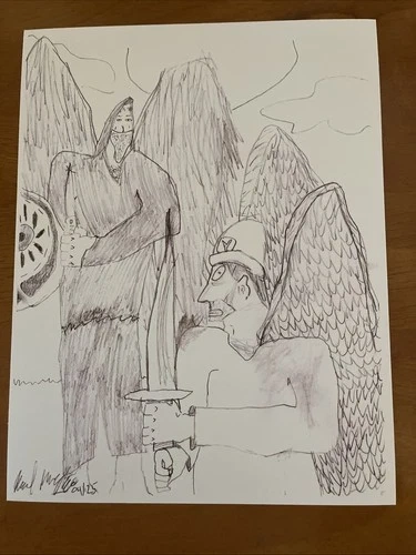 I drew this drawing. I have one heavy duty paper print and one cardboard print available. Dimensions are 8.5”x11”. It is signed by me before printed. Shipping will be $6.00 extra if you want that.