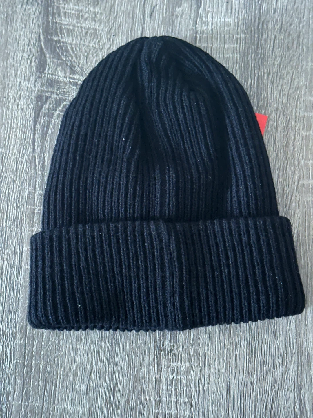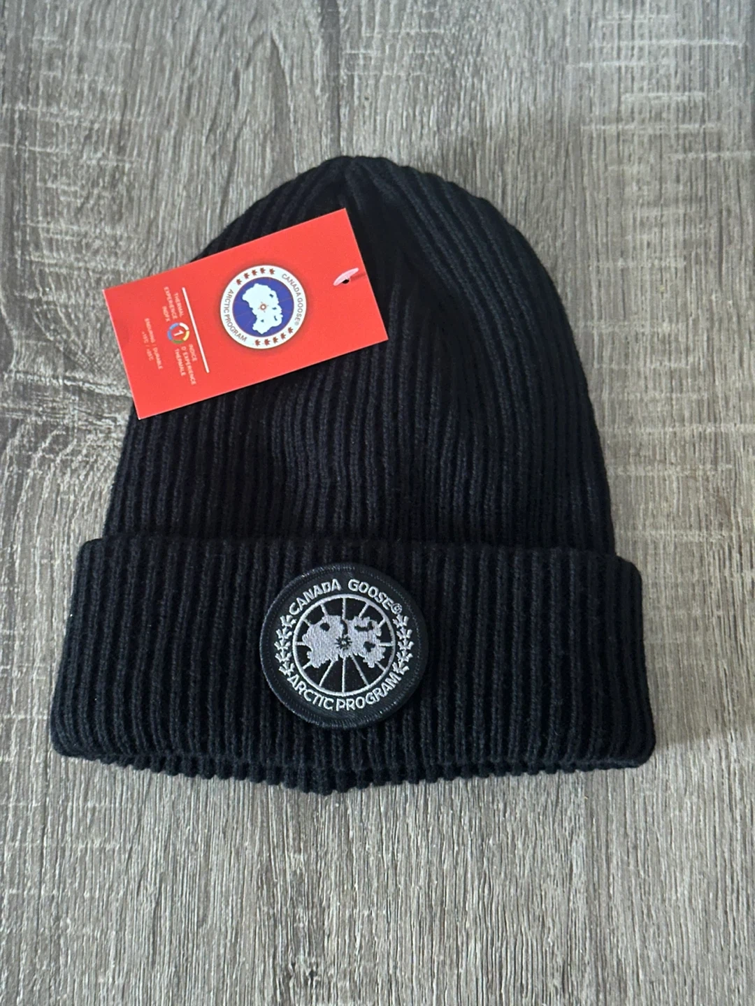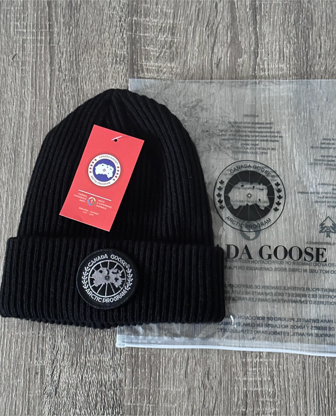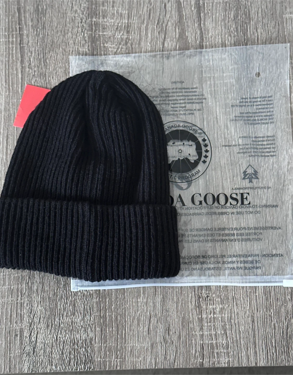 This is a black ribbed beanie hat from Canada Goose. Rib-knit wool beanie. Embroidered logo patch at rolled brim. It's made with a cozy knit material. The hat comes with its original tags and packaging.
