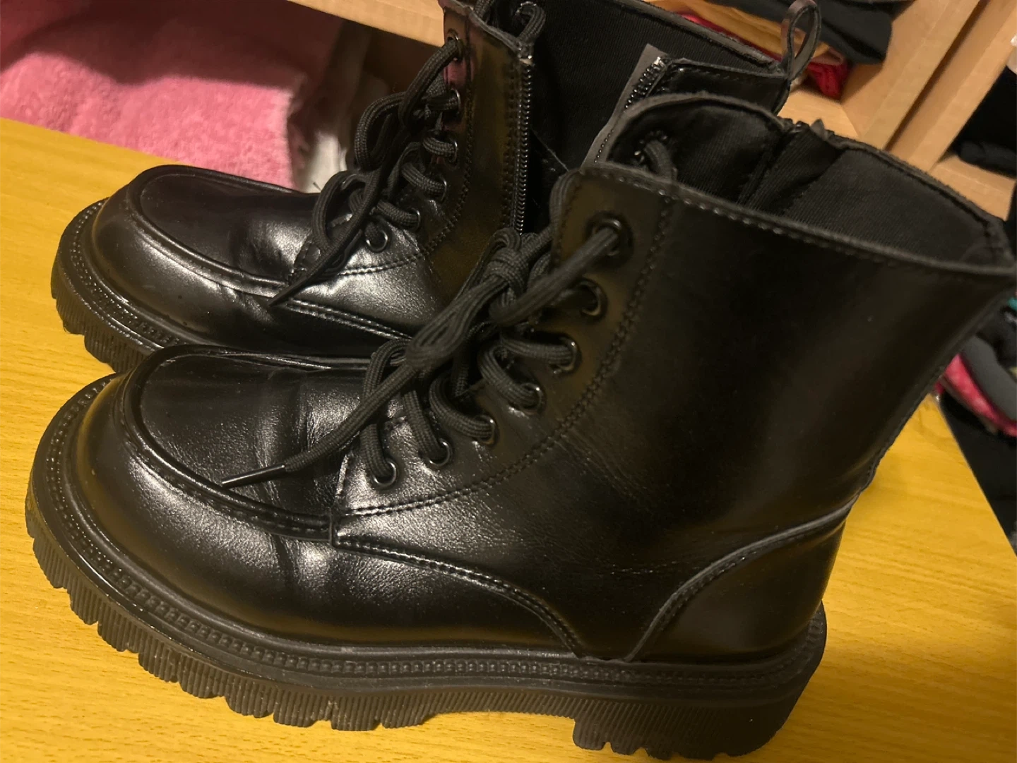Black faux leather combat boots with side zippers. They feature a lace-up front and a durable lug sole. These boots are great for keeping your feet warm and stylish.