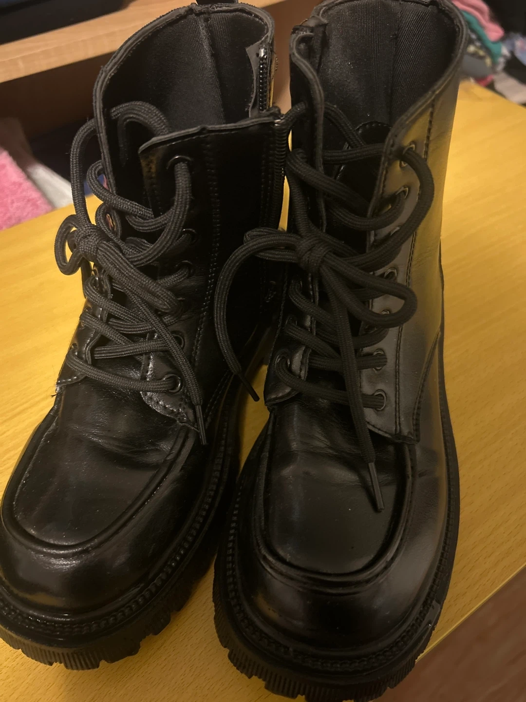 Black faux leather combat boots with side zippers. They feature a lace-up front and a durable lug sole. These boots are great for keeping your feet warm and stylish.