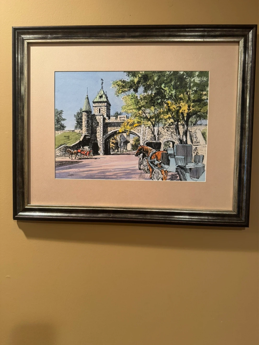 Framed print depicting horse-drawn carriages passing through a stone castle gate. The artwork features a textured, metallic-style frame with a light beige mat. It's a charming scene for home decor.