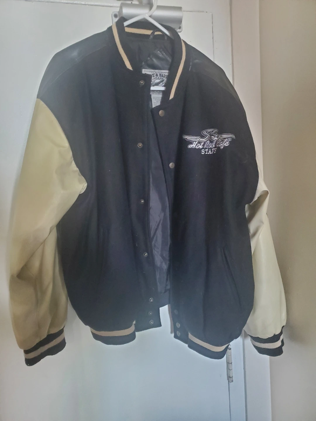 This is a Steve & Barry's "Hot Rod Cafe" staff jacket. It's black with cream-coloured sleeves. The sleeve has "Best Burger in Town" and the years 1955, 1958, 1959, 1960, and 1962 embroidered on it. It's a great piece of memorabilia for fans of classic cars and diners!