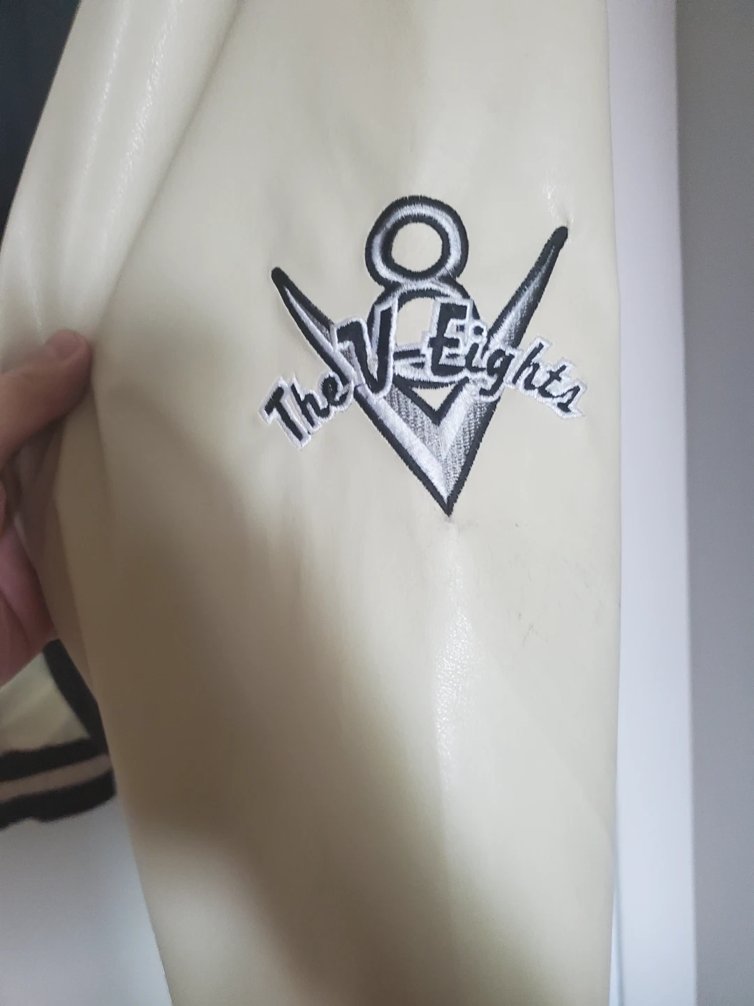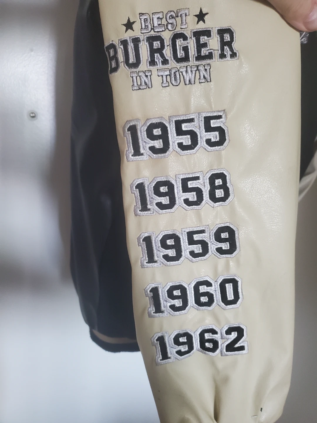 This is a Steve & Barry's "Hot Rod Cafe" staff jacket. It's black with cream-coloured sleeves. The sleeve has "Best Burger in Town" and the years 1955, 1958, 1959, 1960, and 1962 embroidered on it. It's a great piece of memorabilia for fans of classic cars and diners!