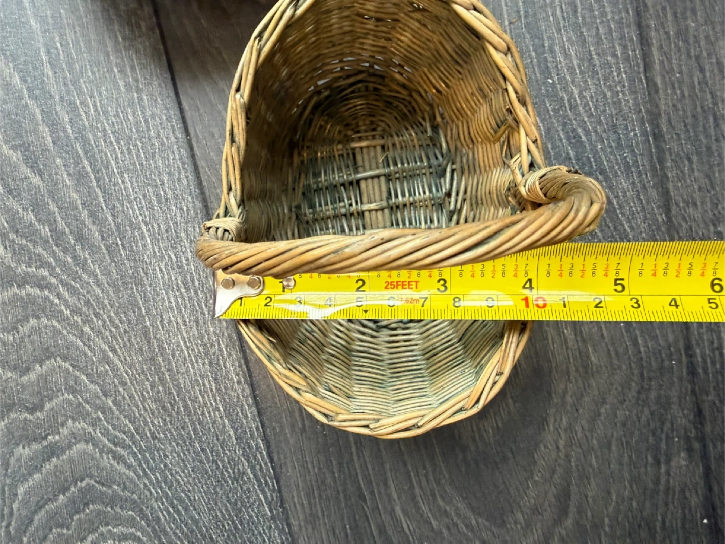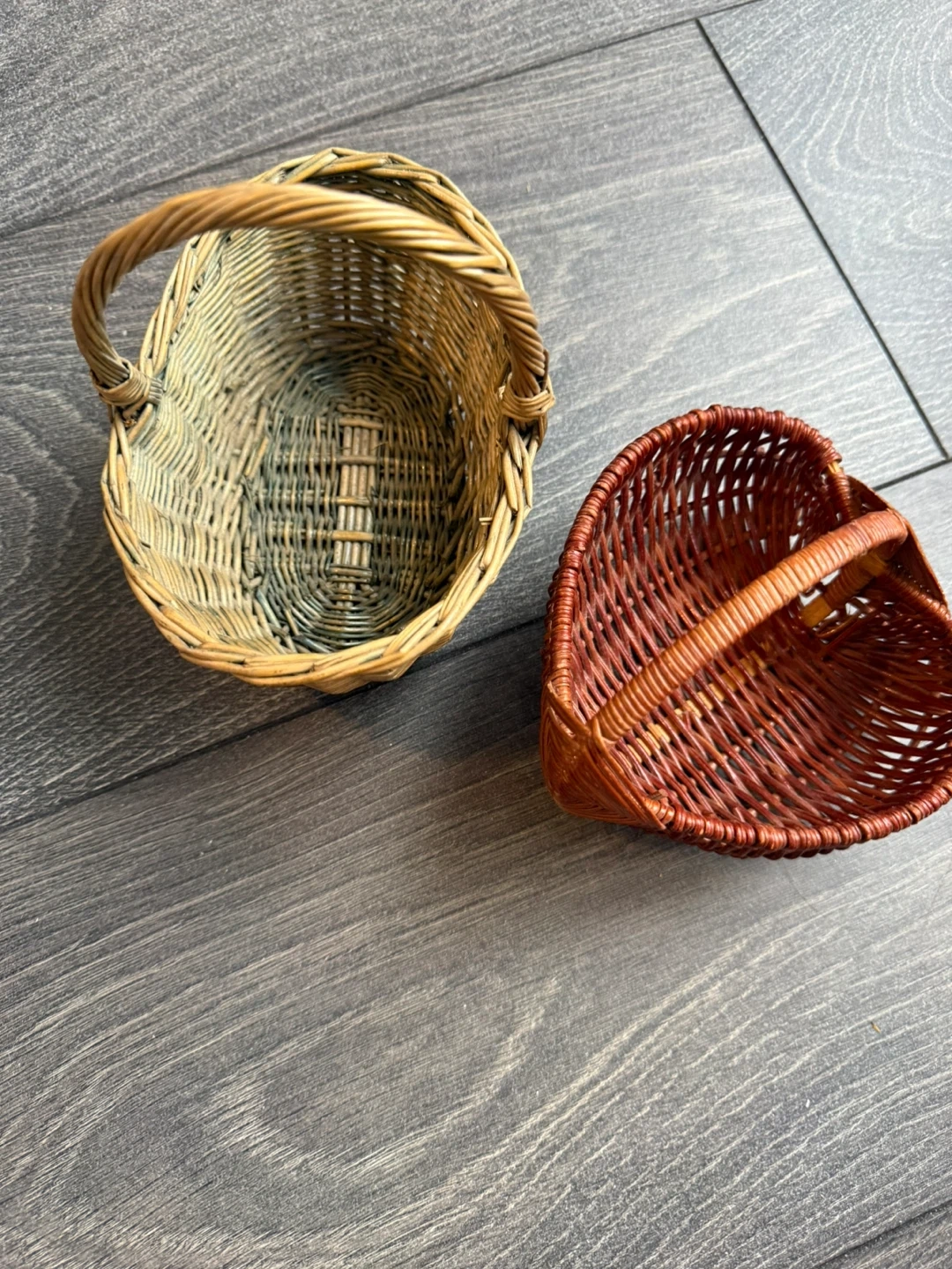 Perfect for Easter! This is a set of two small wicker baskets. One is a natural tan colour and oval shaped, measuring approximately 6 inches long and 4 inches wide. The other is a reddish-brown heart-shaped basket, measuring approximately 5 inches wide and 5 inches long. Both have handles and are made from woven natural materials. They're great for small decorations or organizing trinkets!
