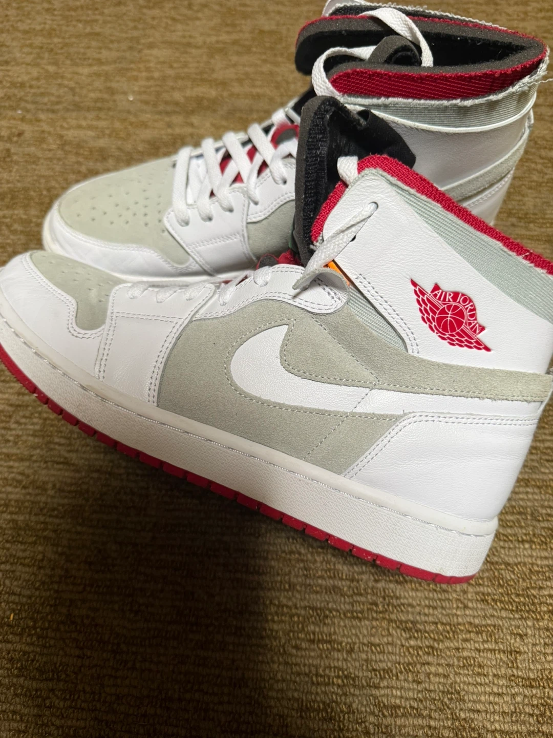 These Air Jordan 1 Mid SE sneakers are white and light grey with red accents. They feature the iconic Jumpman logo. Leather and suede materials.