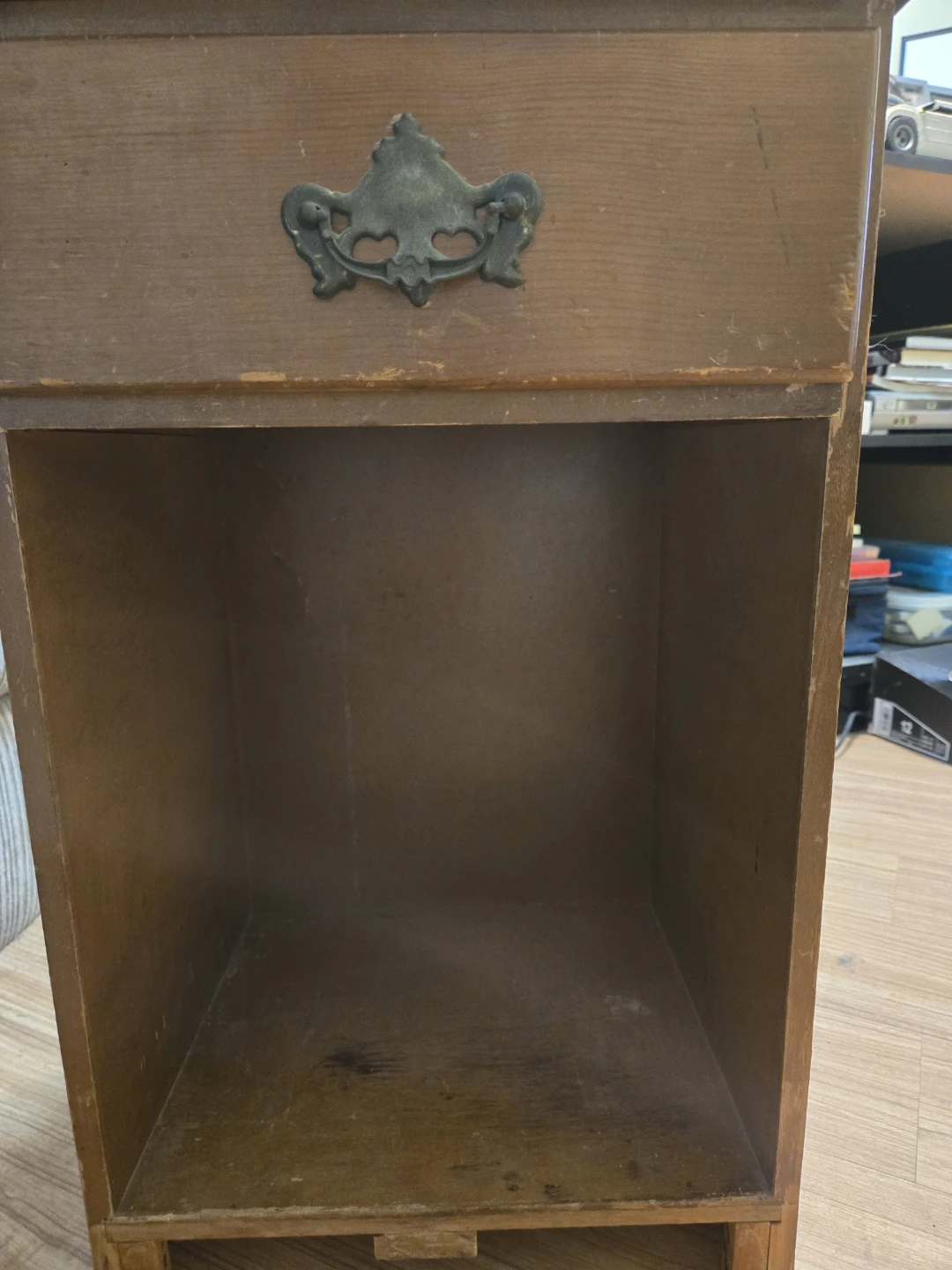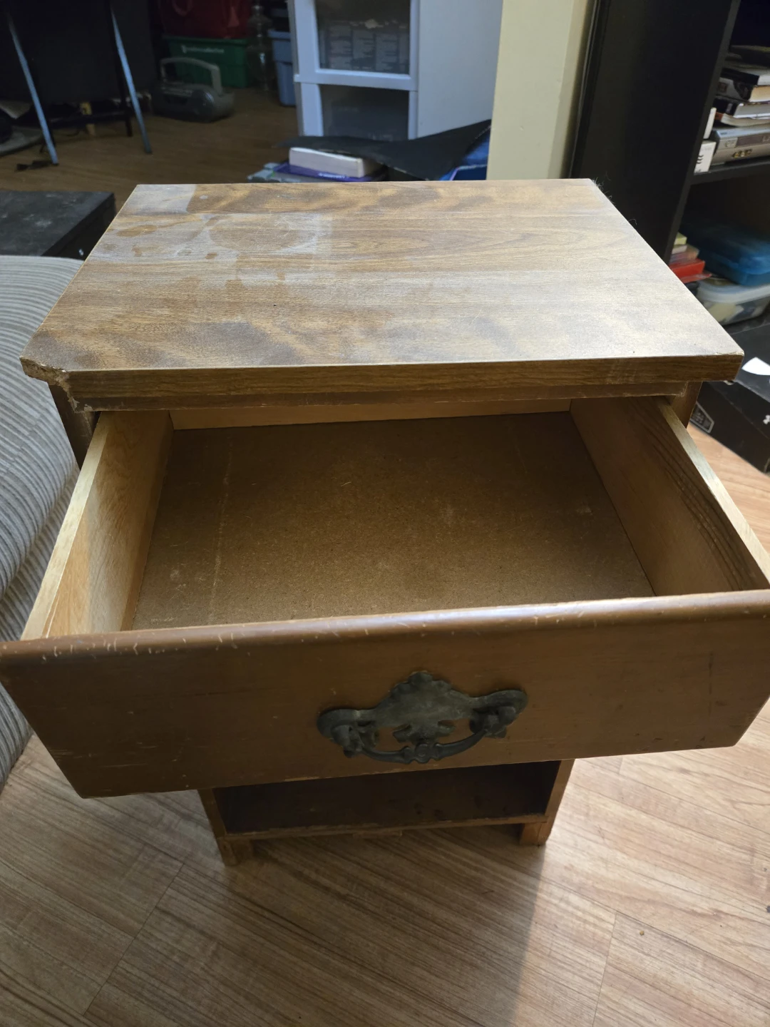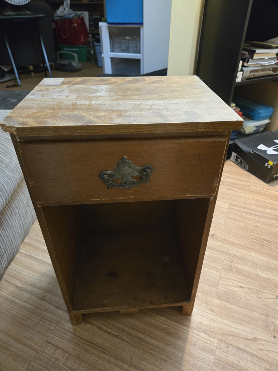 Selling a wooden nightstand. It features a drawer with a decorative metal pull and an open shelf below. It shows some signs of wear and tear, but it's still a functional piece of furniture for your bedroom or living room