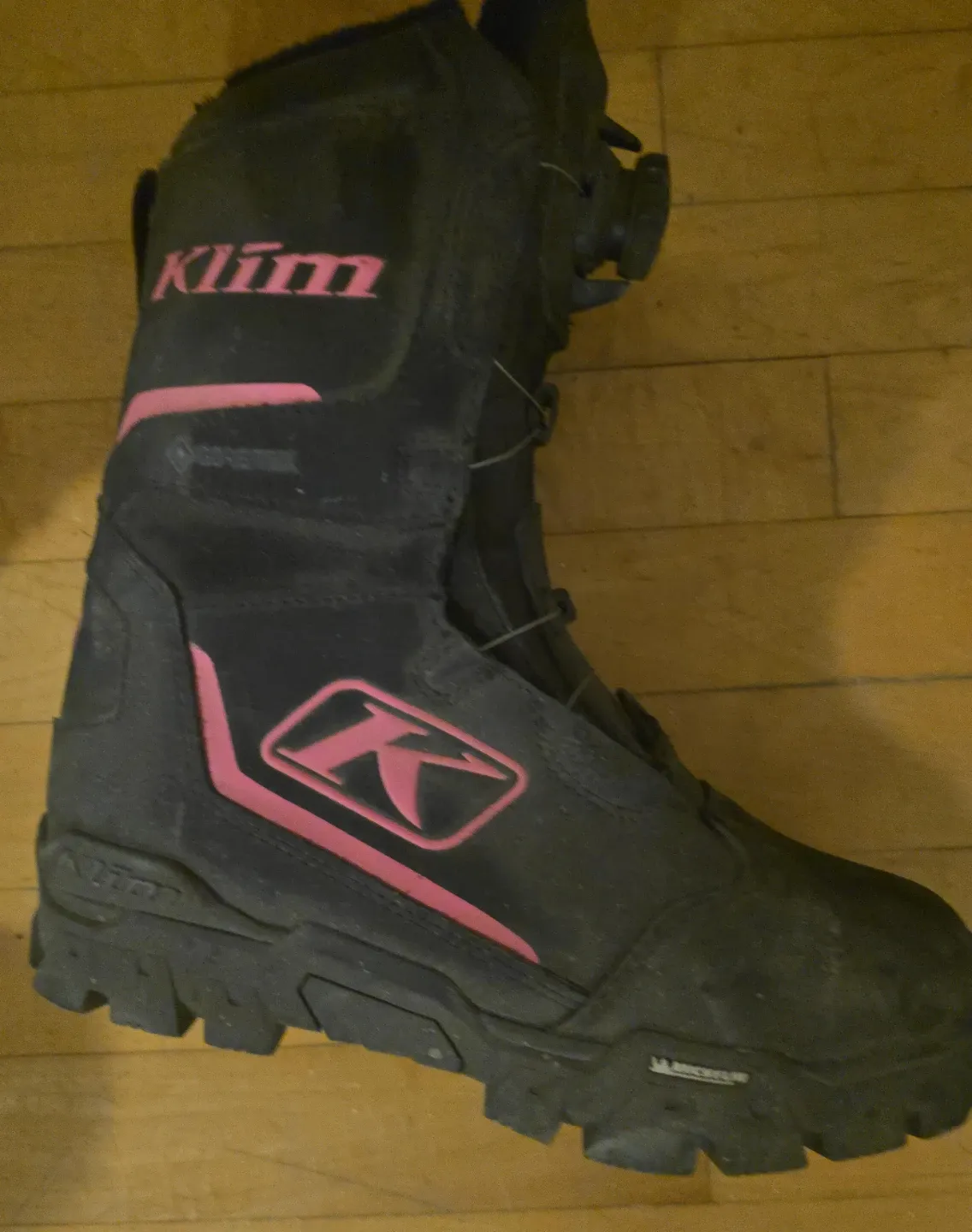 Klim motorcycle boots in black with pink accents. Features Gore-Tex for waterproofing and a Boa lacing system. Michelin sole for grip. These boots are built for tough riding conditions!