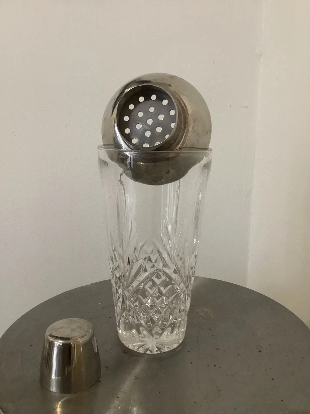 A crystal cocktail shaker with a metal strainer and cap. The glass tumbler features a diamond cut design. This shaker's components are made of stainless steel.